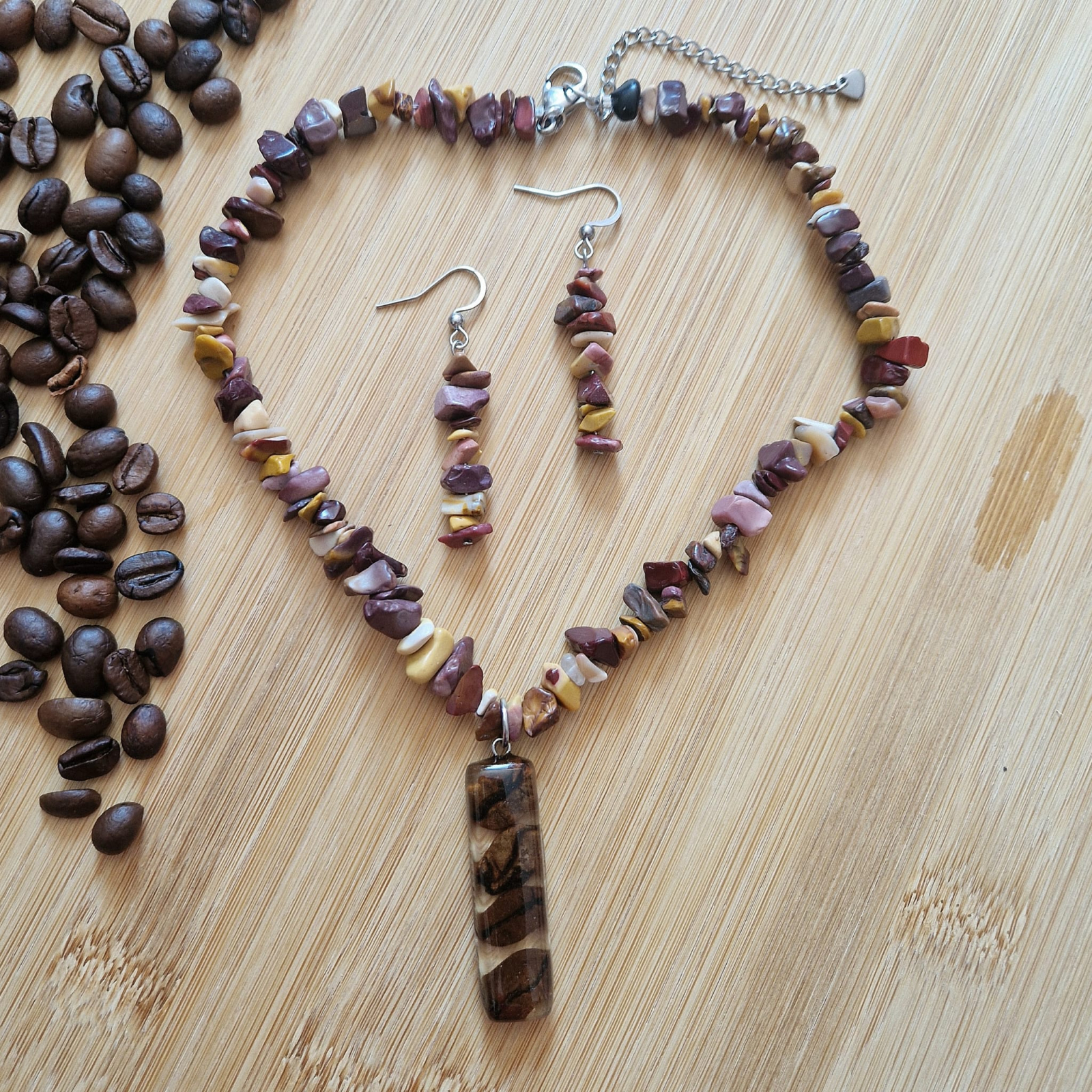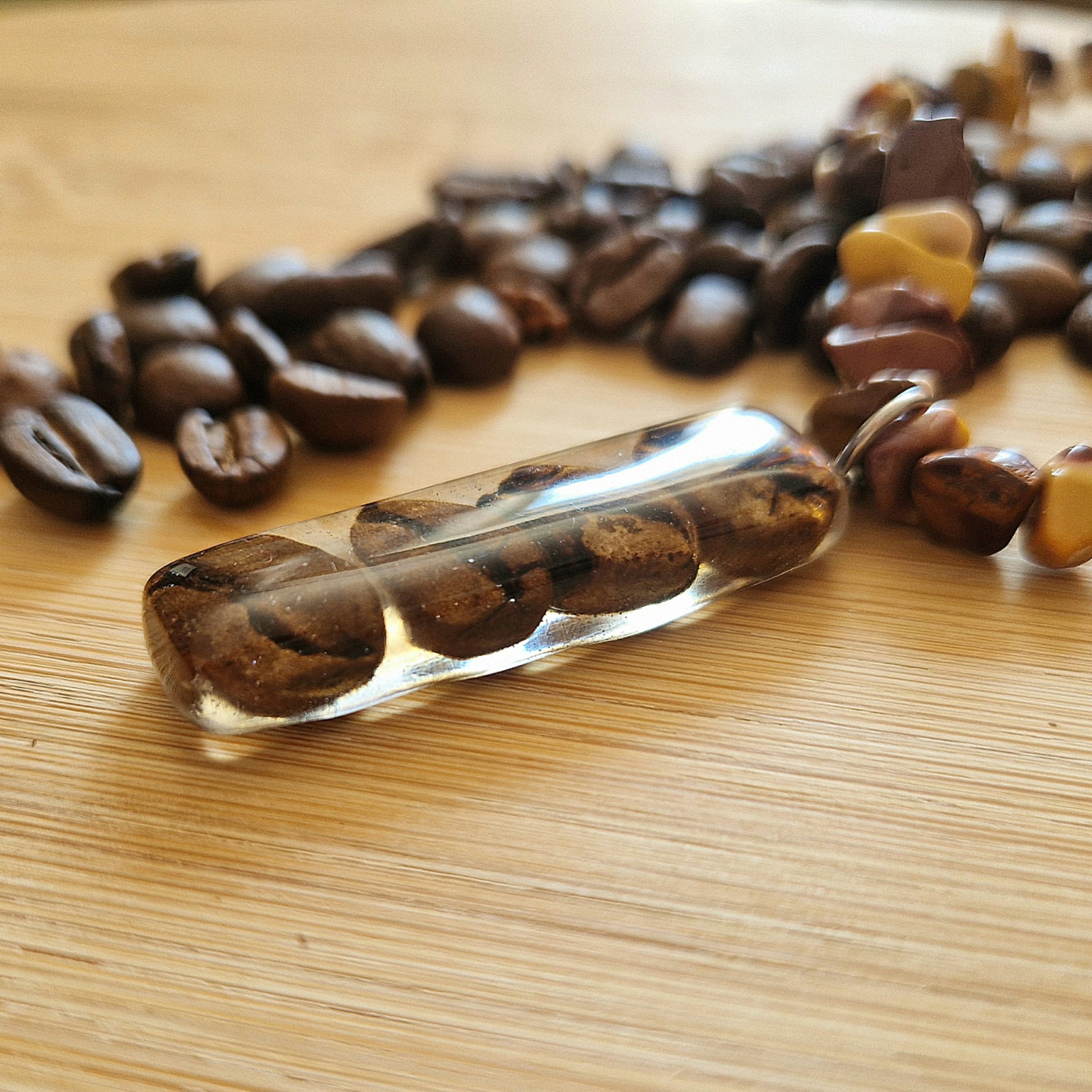 Acest set de bijuterii unicat, lucrat manual, îmbină eleganța cu bogăția naturală. Setul conține un pandantiv și o pereche de cercei, în care boabele de cafea reale sunt încapsulate în rășină cristalină și rezistentă la UV. Piatra naturală de jasp, șlefuită și montată separat, adaugă un plus de rafinament și armonizează perfect cu nuanțele calde ale cafelei și ale pământului.