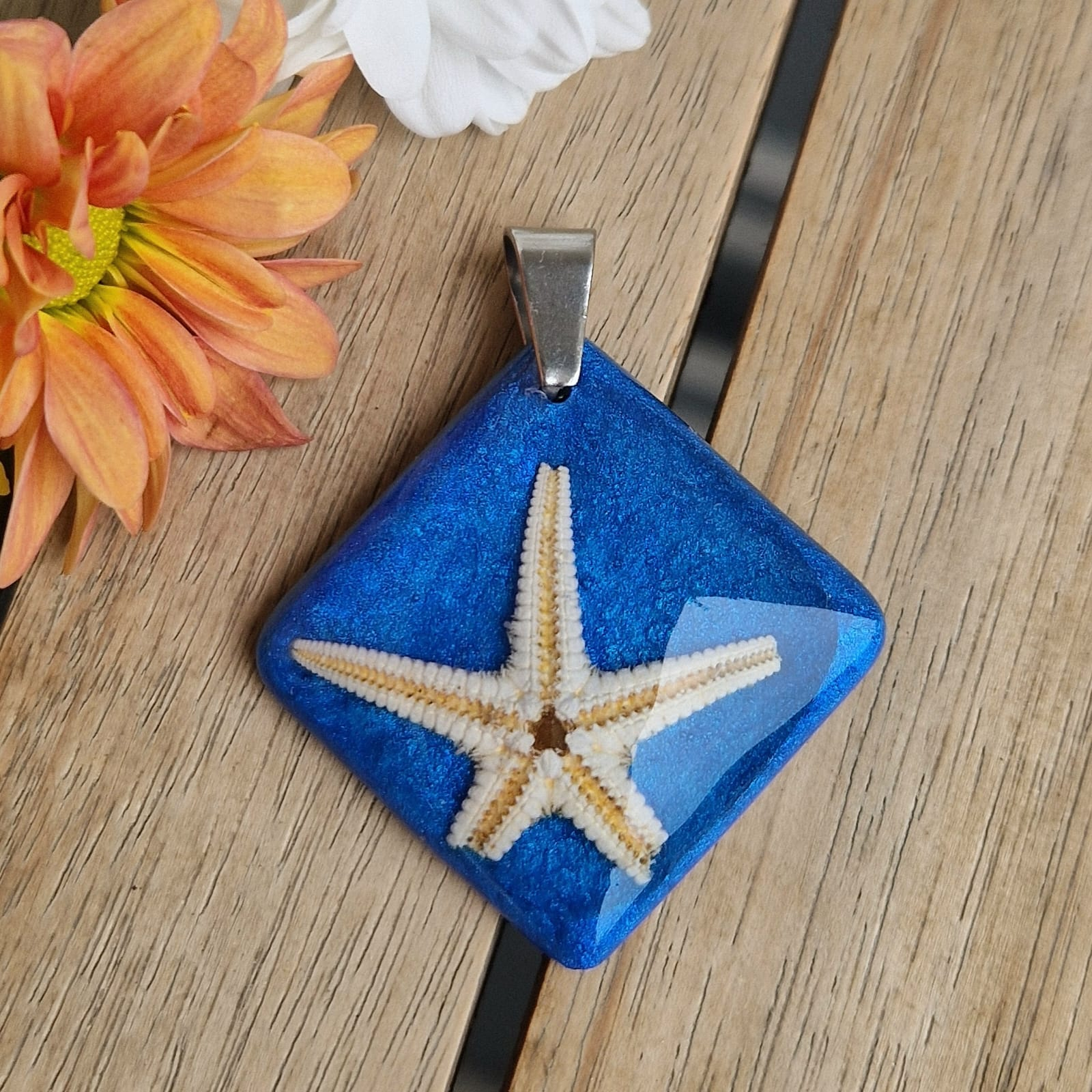 Acest pandantiv unic, realizaț manual, aduce la tine farmecul ascuns al mării. Comori marine autentice au fost încapsulate în rășina cristalină, rezistentă la UV, astfel încât să poți purta cu tine minunile din adâncurile mării. Fiecare detaliu evocă valurile, albastrul profund și lumea specială a oceanului.