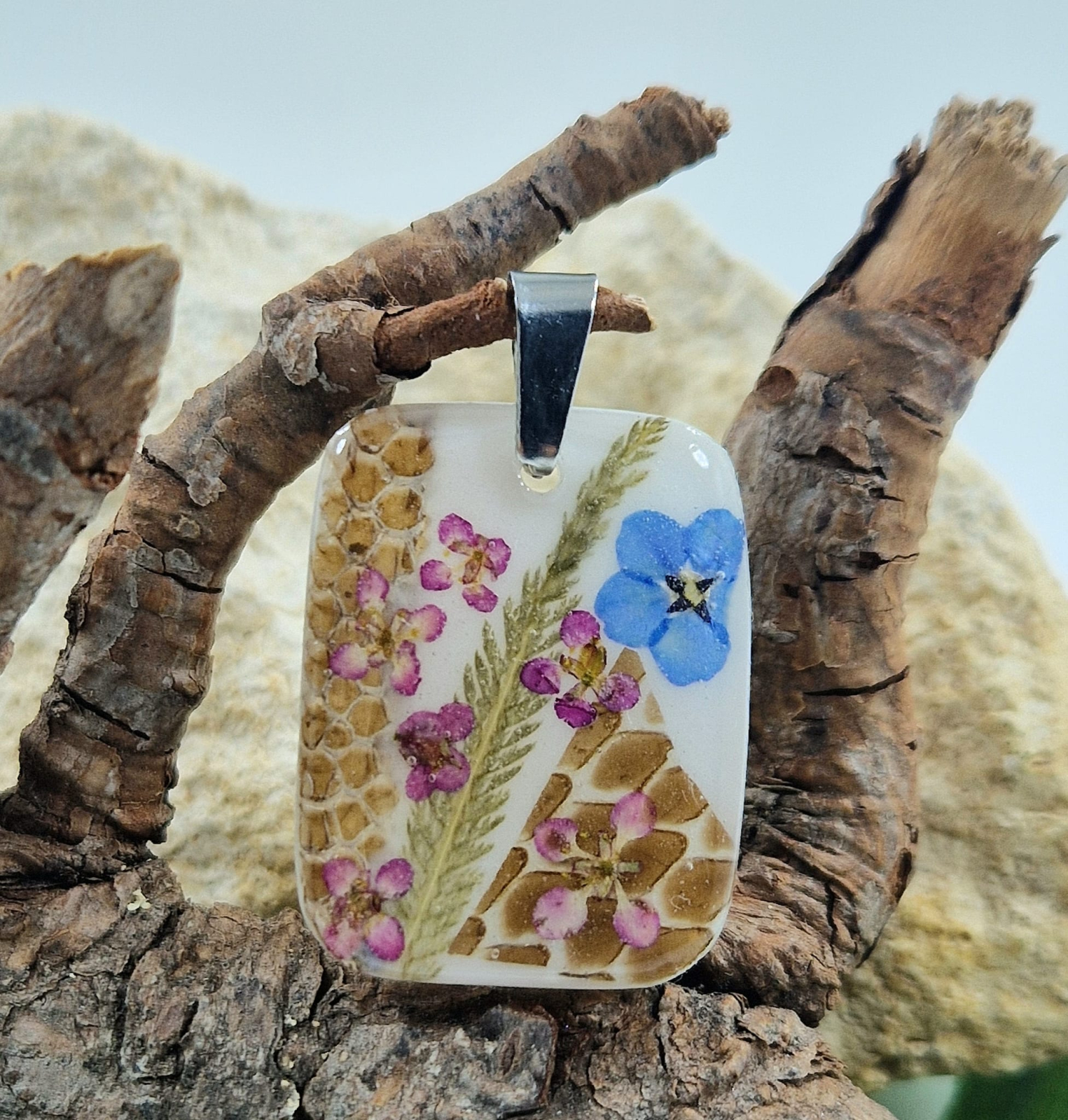 Fiecare pandantiv este unicat, datorită elementelor naturale încapsulate în rășină. Rășina cristalină, rezistentă la UV, asigură că aceste elemente nu își pierd strălucirea în timp și nu se îngălbenesc. Este ușoară, dar durabilă, oferind un efect vizual asemănător sticlei, fără a fi fragilă. Bijuteria nu necesită întreținere specială.