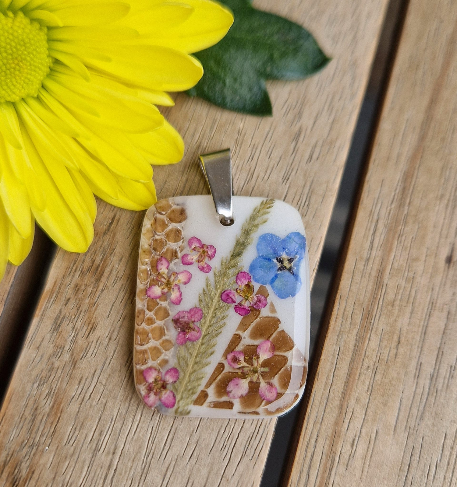 Acest pandantiv unic, realizat manual, surprinde frumusețea sălbatică și misterioasă a naturii. Pielea naturală de șarpe, alături de flori și plante sălbatice presate, încorporate cu grijă în rășină, conferă bijuteriei un aspect aparte – sofisticat, expresiv și plin de caracter. Rășina cristalină, rezistentă la UV, protejează textura și nuanțele acestor elemente naturale, păstrându-le vii și vibrante în timp.