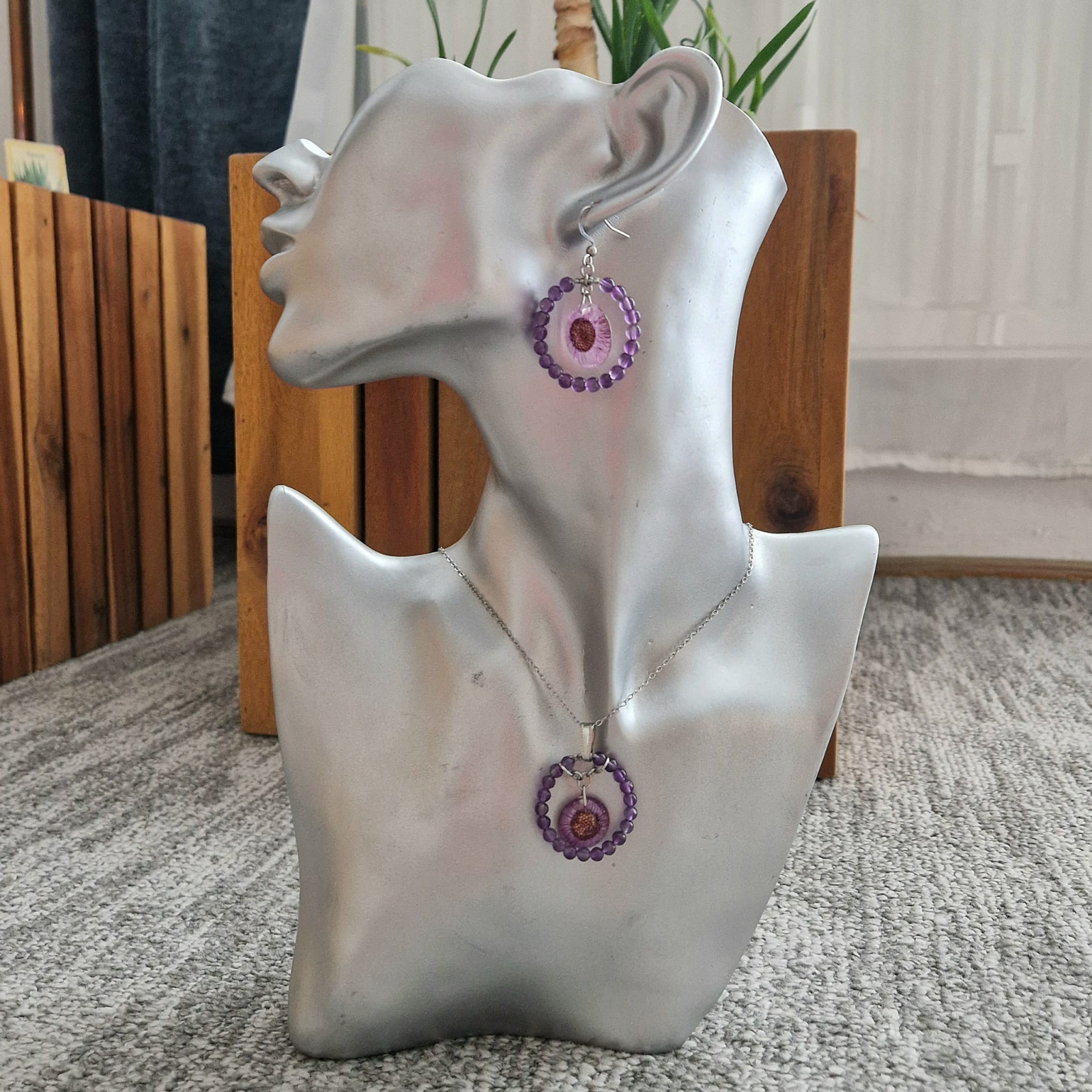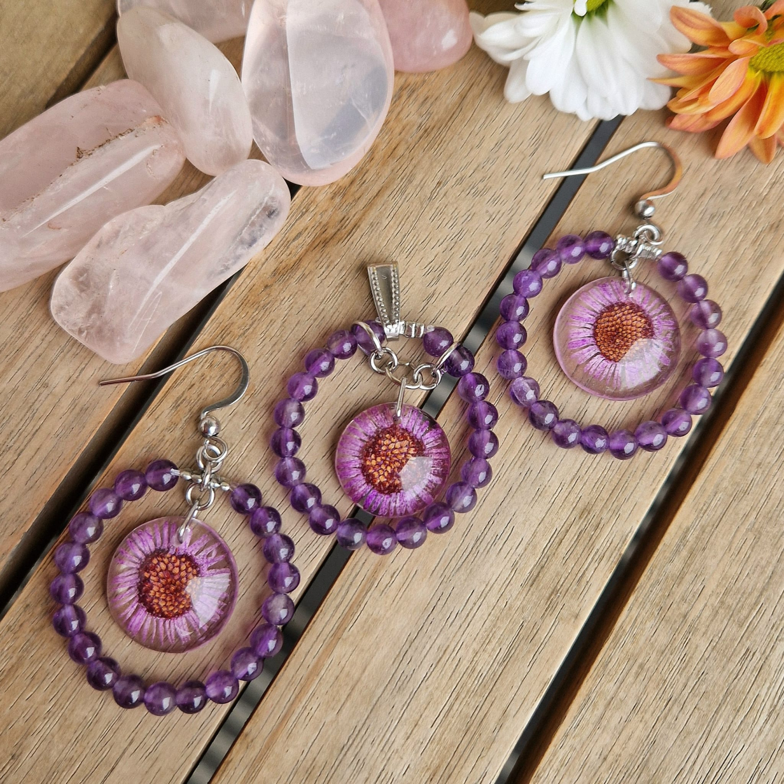 Acest set de bijuterii unic îmbină frumusețea naturală a ametistului cu delicatețea florilor reale. Setul include un pandantiv și o pereche de cercei, realizate manual din ametist și flori naturale, încapsulate în rășină cristalină, rezistentă la UV.