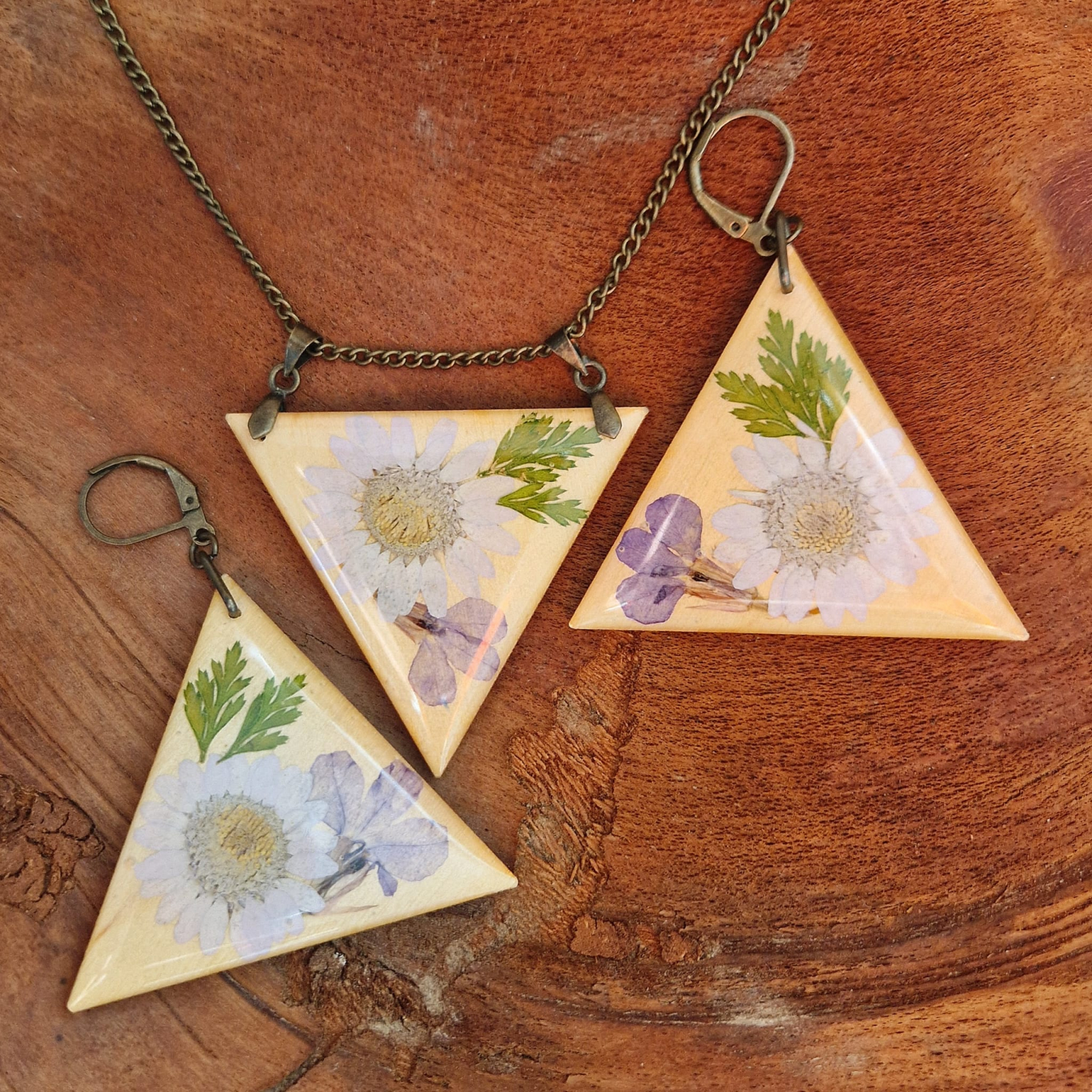 Acest set de bijuterii unic îmbină minunat frumusețea naturii cu designul modern. Setul include un pandantiv și cercei, confecționați din flori de câmp și rășină cristalină, rezistentă la UV.