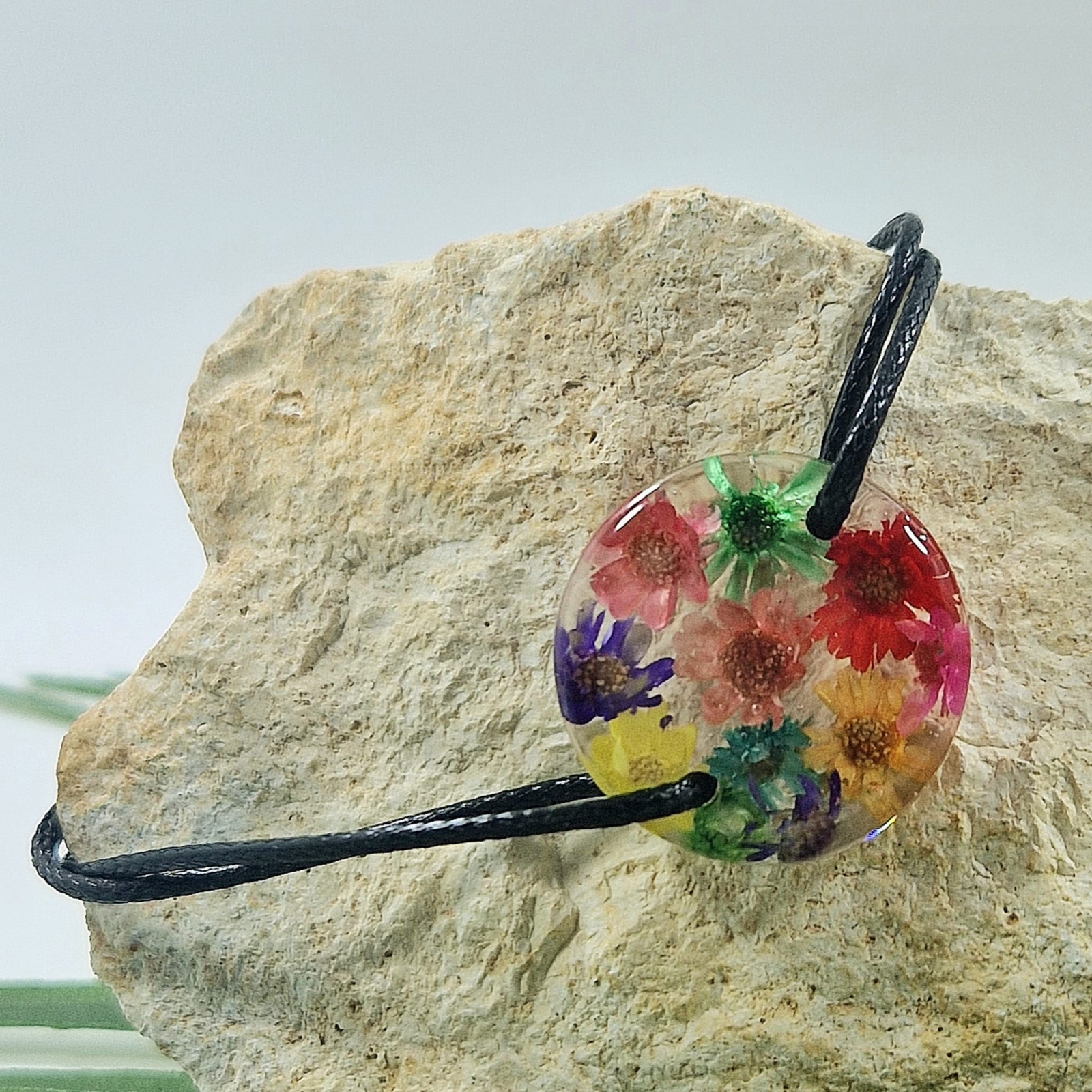 Această brățară realizată manual îmbină farmecul naturii cu tehnologia modernă a rășinii, creând o bijuterie unică și fascinantă. Detaliile delicate ale floriilor  sunt protejate de rășina UV, care garantează că culorile vibrante și frumusețea naturală a florilor vor rămâne intacte. Șnurul reglabil asigură o purtare confortabilă și o durabilitate îndelungată.
