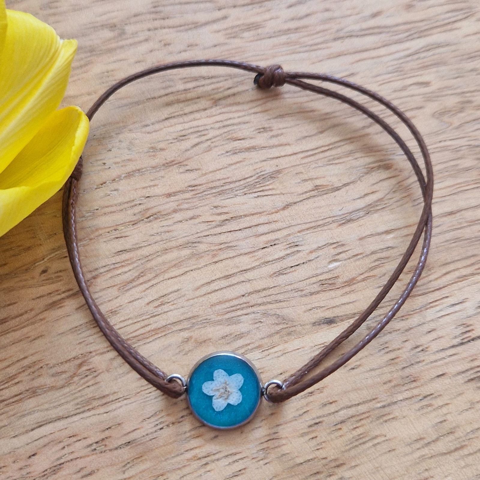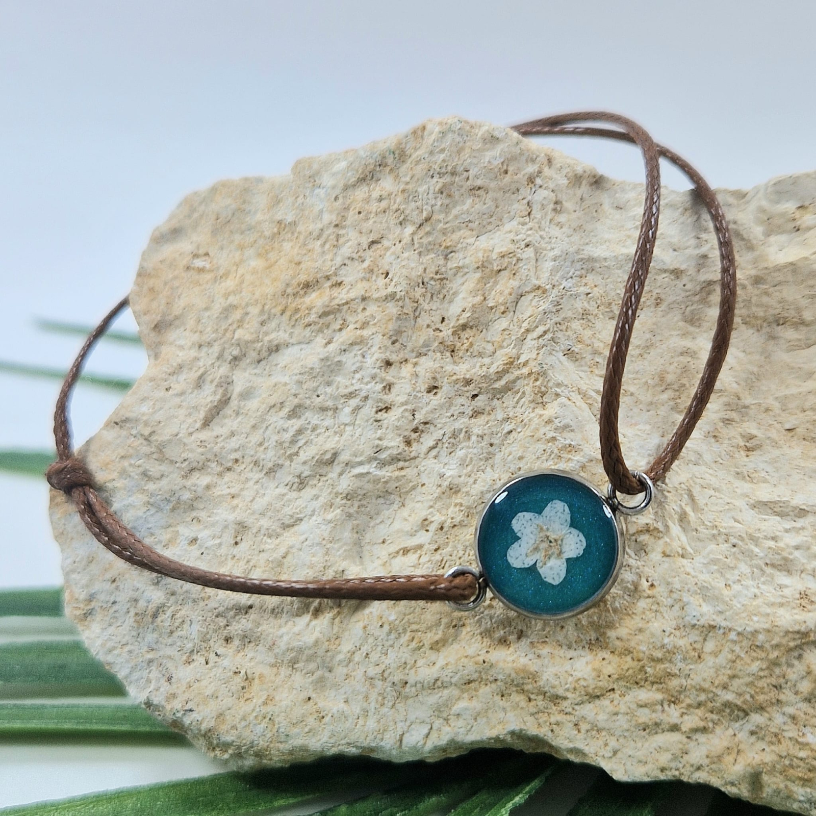 • Materiale utilizate: Rășină rezistentă la UV, flori de nu.ma-uita, șnur, aliaj metalic – Materiale durabile, dar cu un aspect natural, care oferă longevitate bijuteriei.