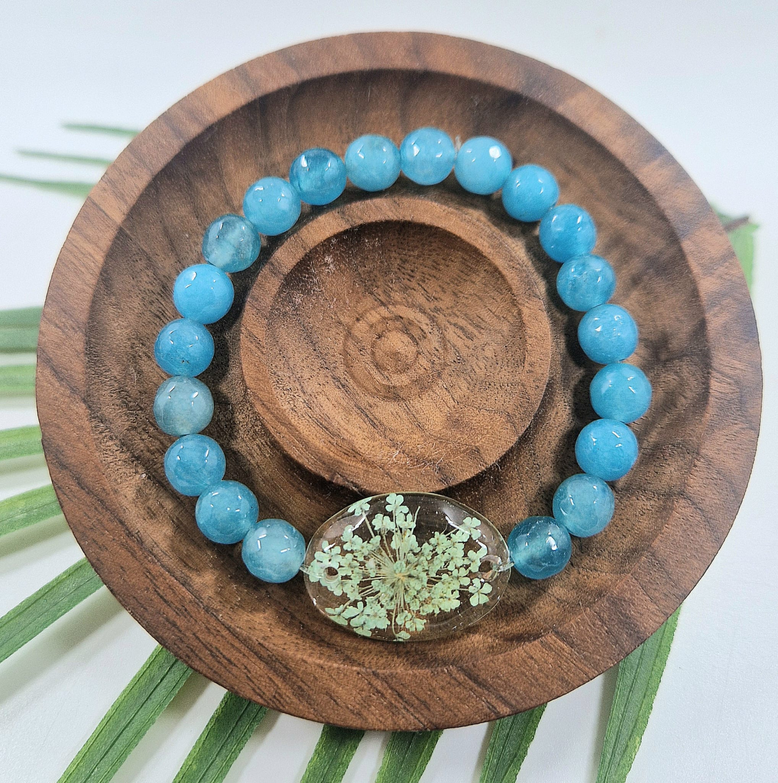 Fiecare piatră de apatit are nuanțe și texturi proprii, iar florile din medalion sunt unice ca aranjament. Astfel, fiecare brățară este diferită și specială.