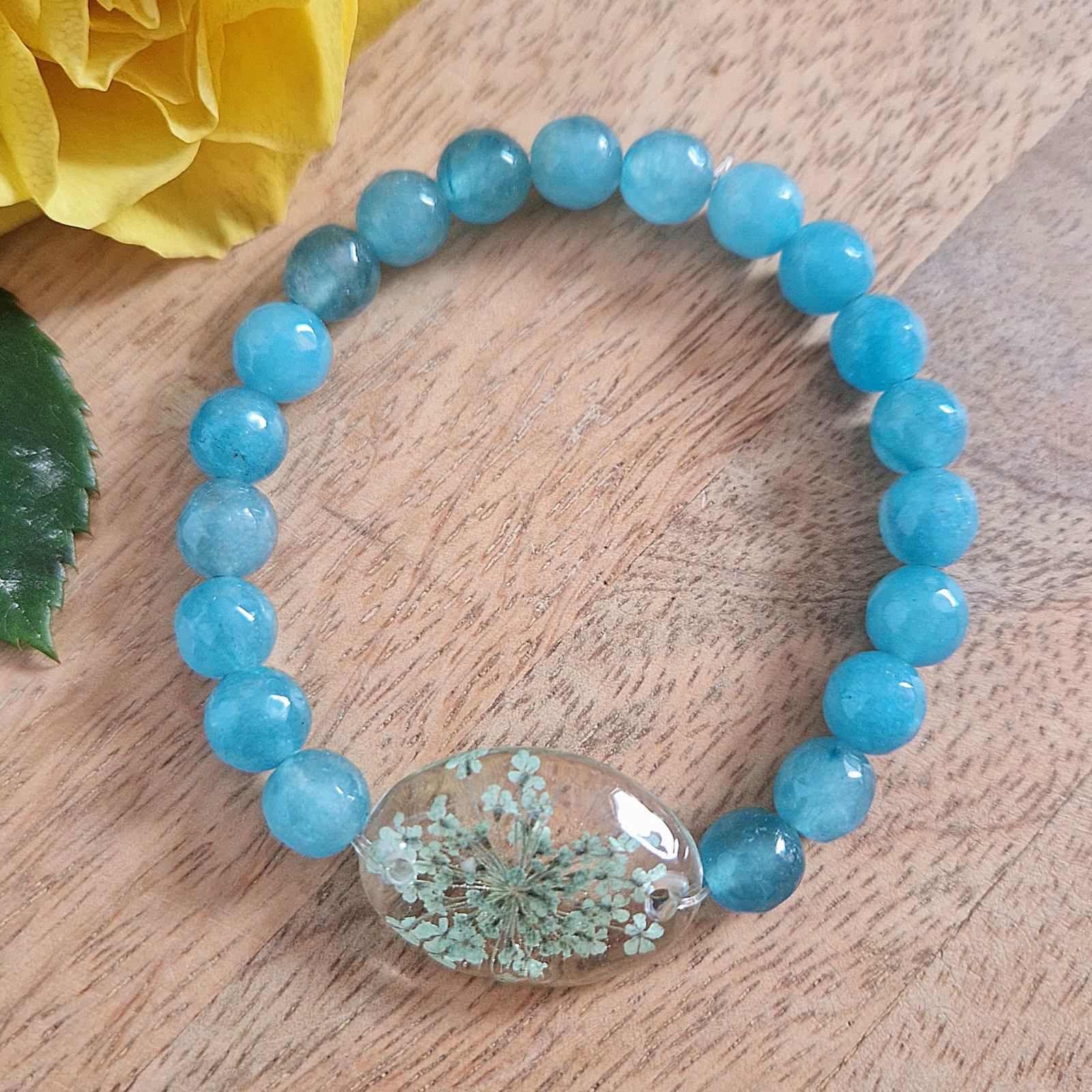 Brățara este completată de un medalion artizanal, care conține flori naturale sălbatice (trifoi cu patru foi), atent conservate în rășină rezistentă la UV. Rășina cristalină protejează florile și le păstrează frumusețea delicată, făcând fiecare piesă unică și irepetabilă.
