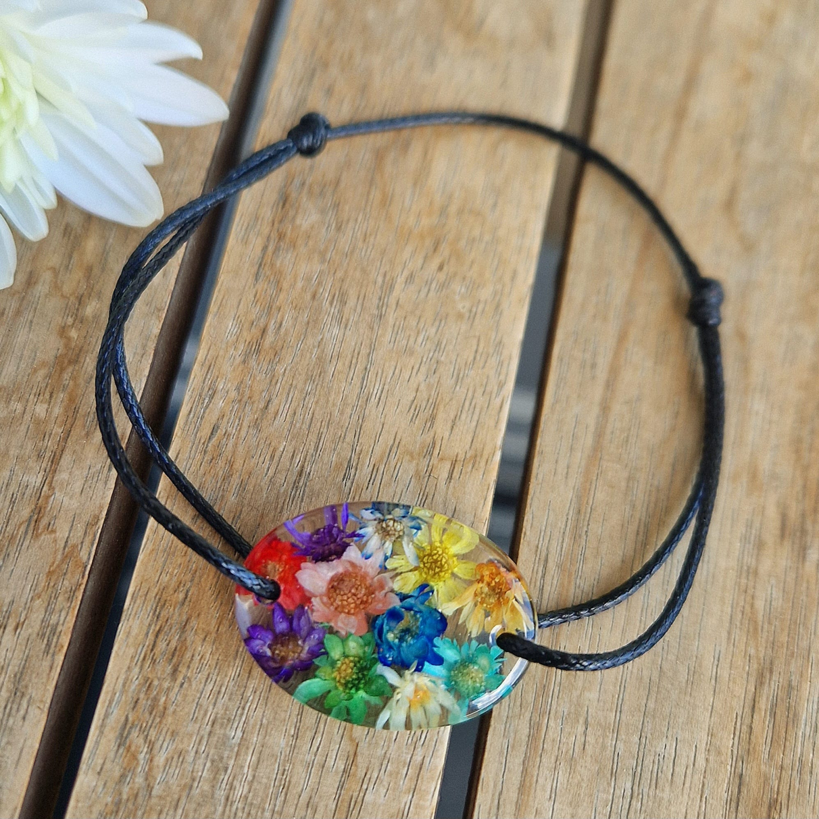 Această brățară realizată manual îmbină farmecul naturii cu tehnologia modernă a rășinii, creând o bijuterie unică și fascinantă. Detaliile delicate ale floriilor  sunt protejate de rășina UV, care garantează că culorile vibrante și frumusețea naturală a florilor vor rămâne intacte. Șnurul reglabil asigură o purtare confortabilă și o durabilitate îndelungată.