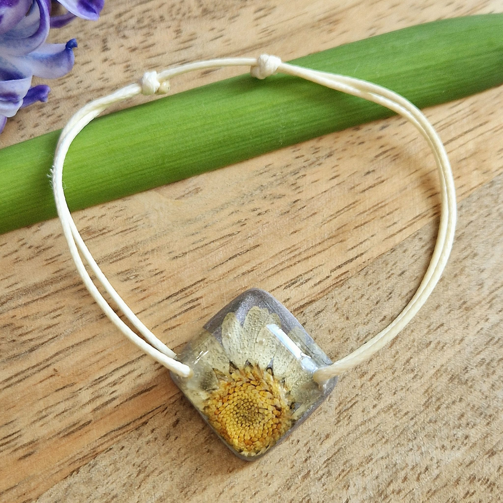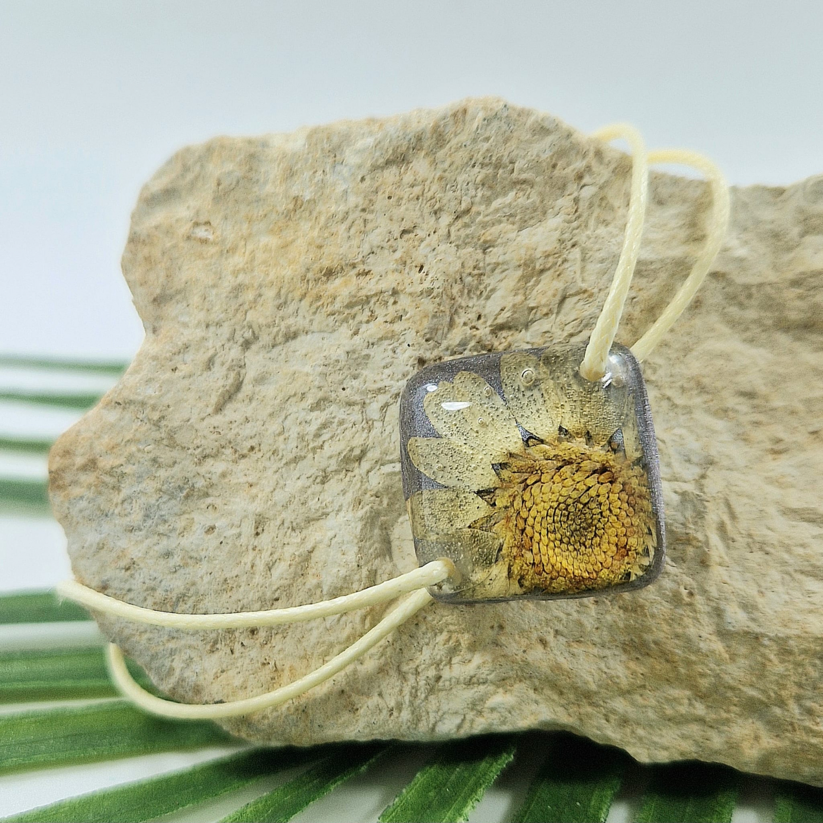 • Materiale utilizate: Rășină rezistentă la UV, margareta, șnur – Materiale durabile, dar cu un aspect natural, care oferă longevitate bijuteriei. Nu provoacă reacții alergice, deoarece nu conține elemente metalice.