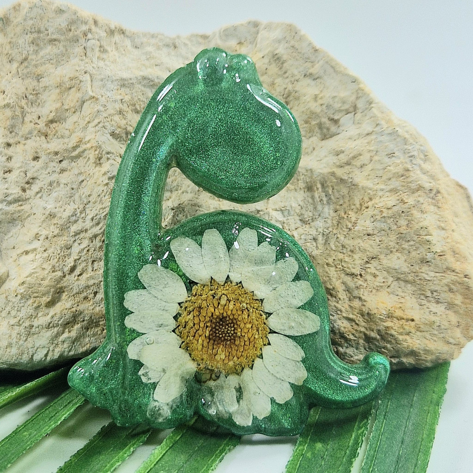 Materiale: Rășină rezistentă la UV, margaretă, aliaj metalic – Frumusețe naturală și durabilitate.