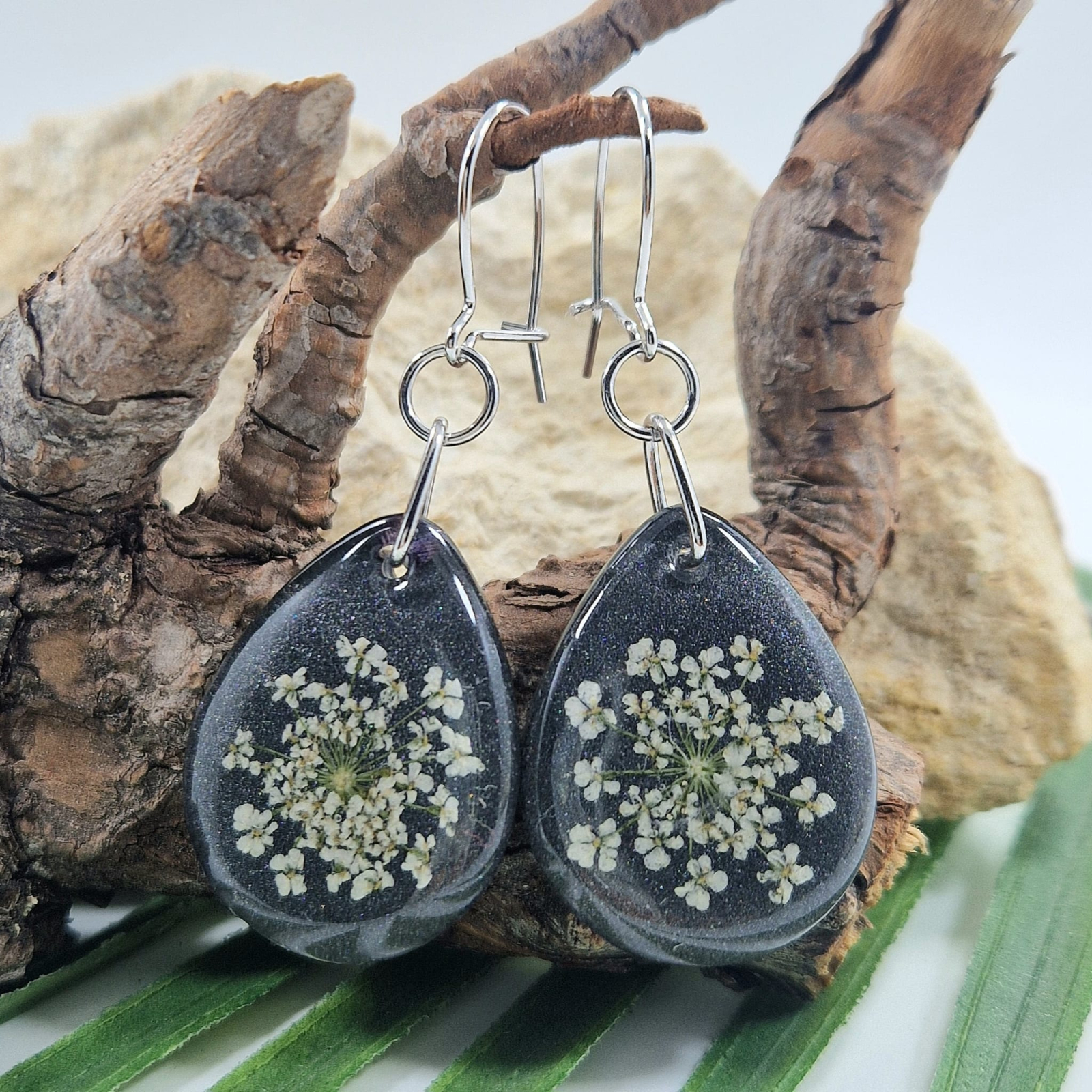 Acești cercei unici, realizați manual, poartă în ei comorile speciale ale naturii, atent încapsulate în rășină rezistentă la UV. Floarea uscată se evidențiază elegant oferind o notă naturală bijuteriei. Împreună cu baza din argint pur 925, acești cercei sunt alegerea perfectă pentru purtarea zilnică, dar și pentru ocazii speciale.