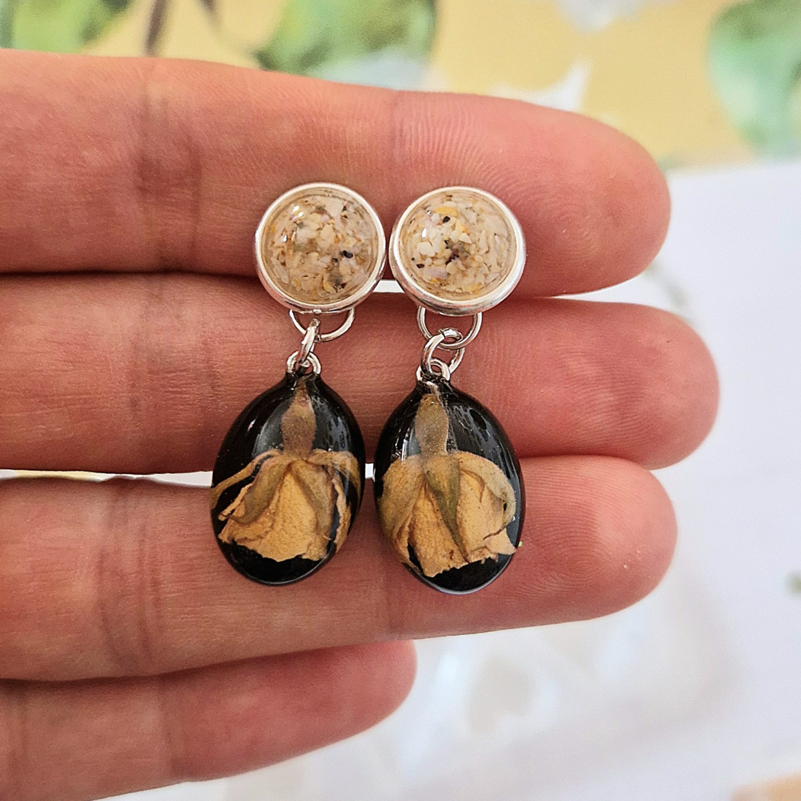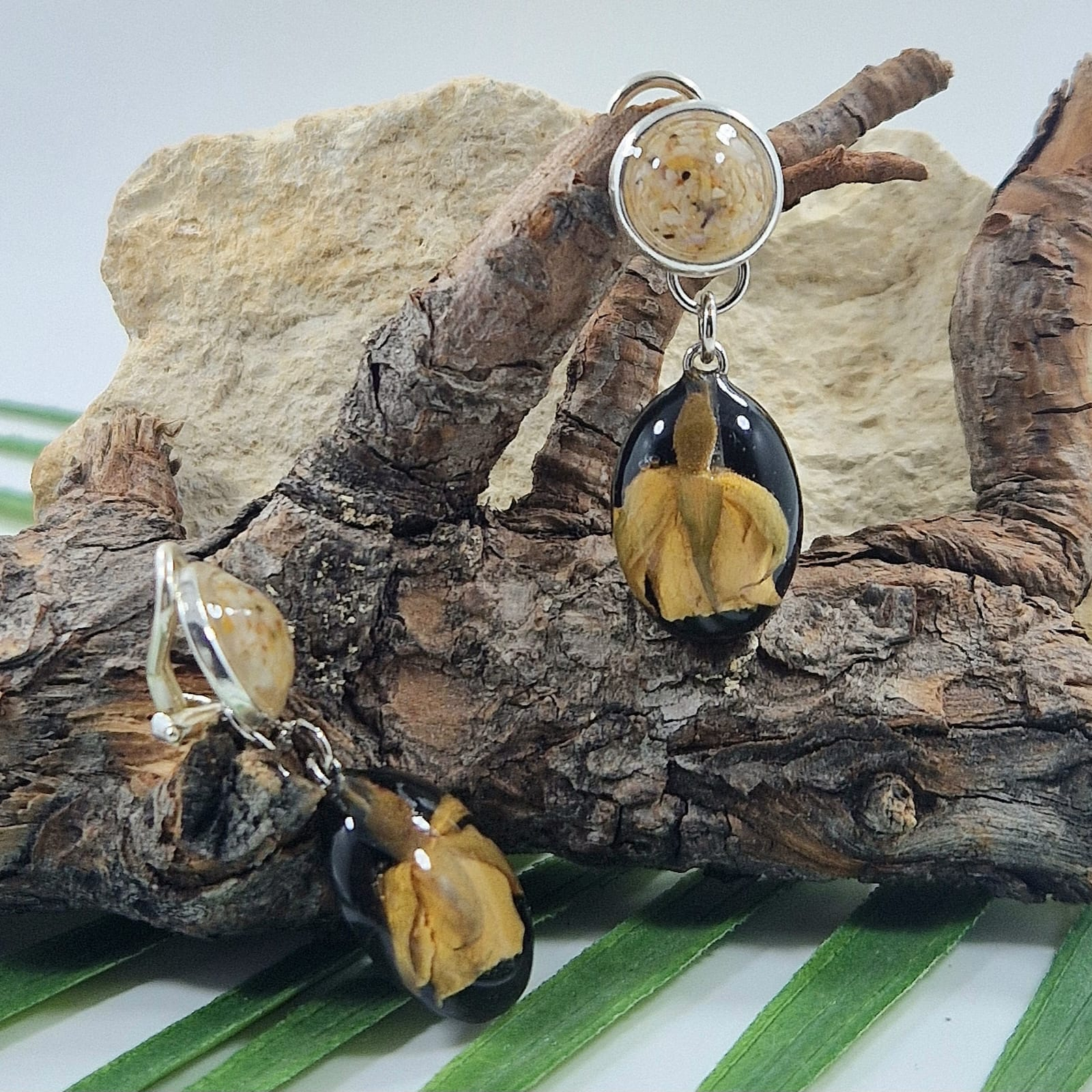 Fiecare pereche de cercei este unică, datorită elementelor naturale încorporate în rășină. Rășina cristalină, rezistentă la UV, nu se îngălbenește și menține frumusețea în timp. Este ușoară și rezistentă, oferind un efect similar sticlei, dar fără a fi fragilă. Cerceii nu necesită întreținere specială.