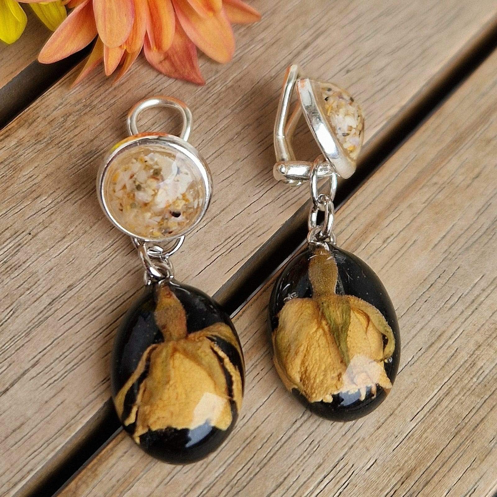 Cercei artizanali cu clips din argint – Magia naturii capturată în rășină