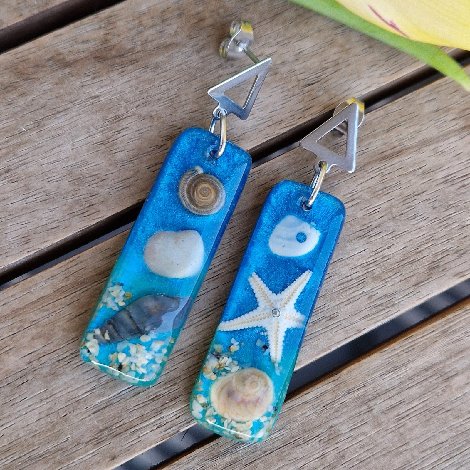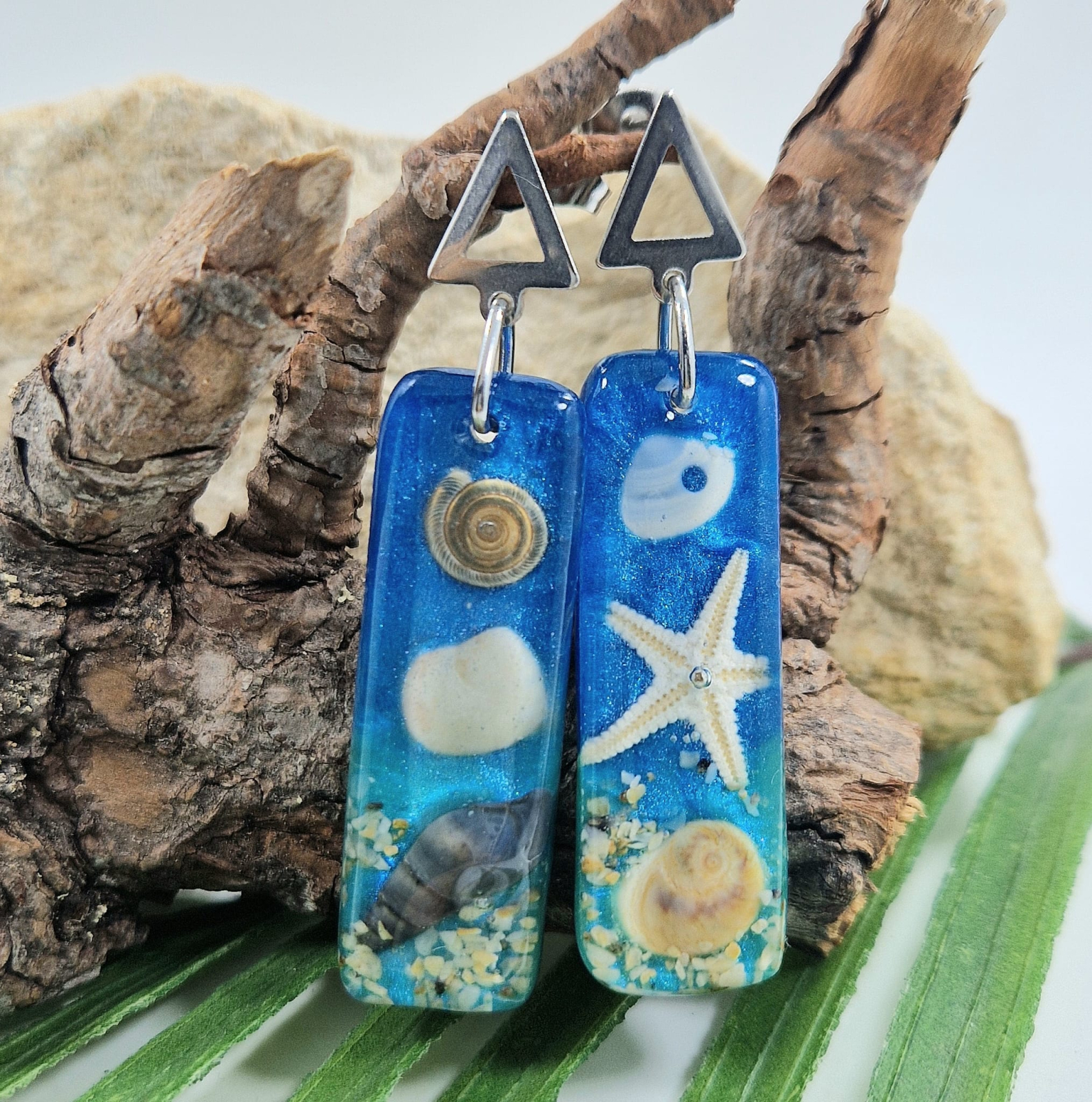 Cercei artizanali – Comoriile mării capturate în rășinăAcești cercei unici, realizați manual, aduc la tine farmecul ascuns al mării. Comori marine autentice au fost încapsulate în rășina cristalină, rezistentă la UV, astfel încât să poți purta cu tine minunile din adâncurile mării. Fiecare detaliu evocă valurile, albastrul profund și lumea specială a oceanului.