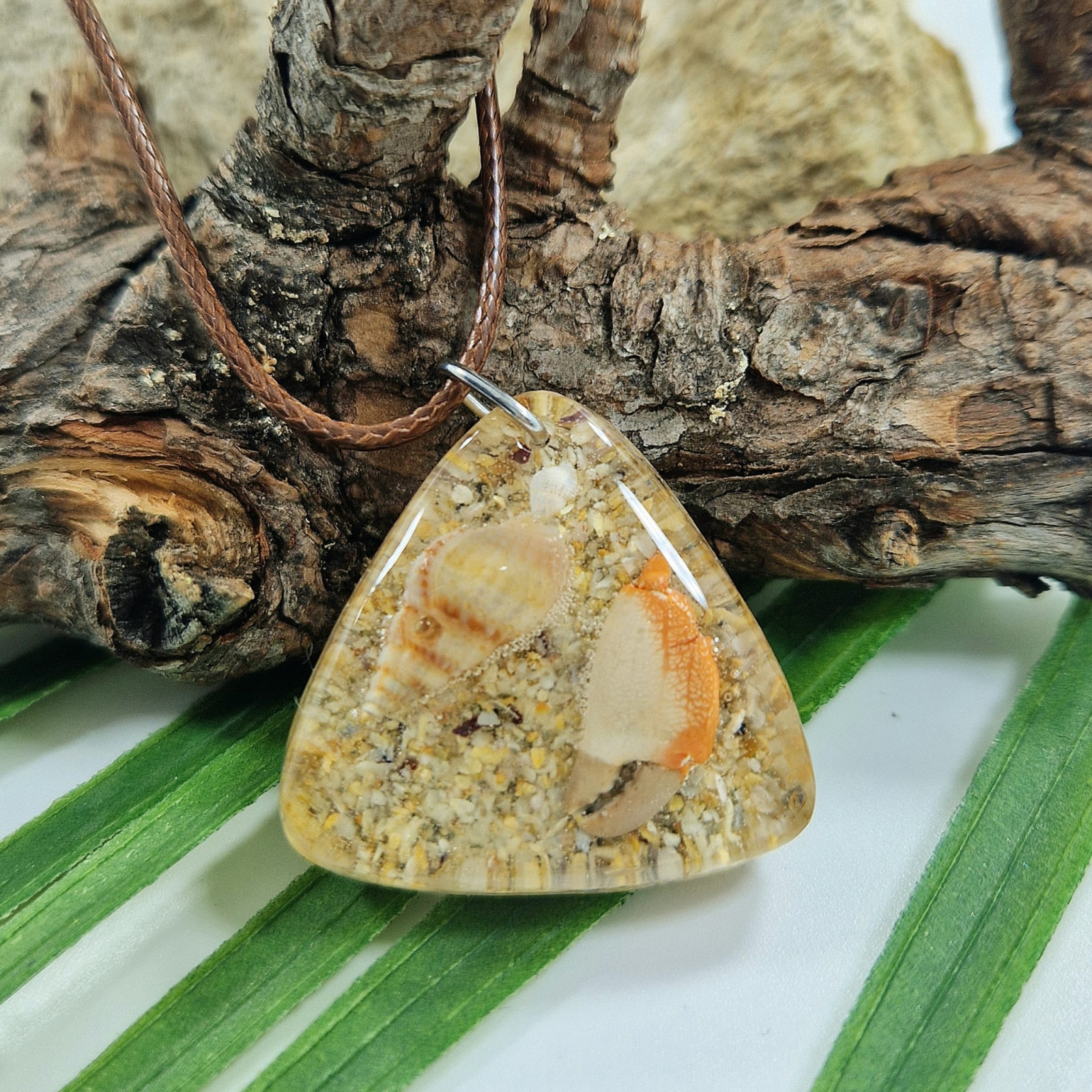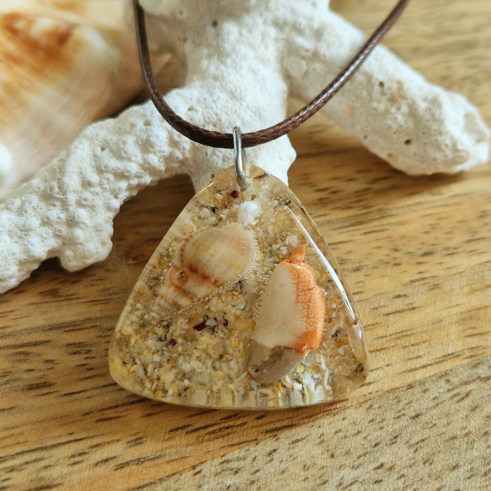 • Materiale folosite: Rășină rezistentă la UV, nisip, clește de rac, scoici, oțel inoxidabil (pandantiv), aliaj metalic + șnur  (colier) – Materiale naturale, durabile și prietenoase cu pielea.