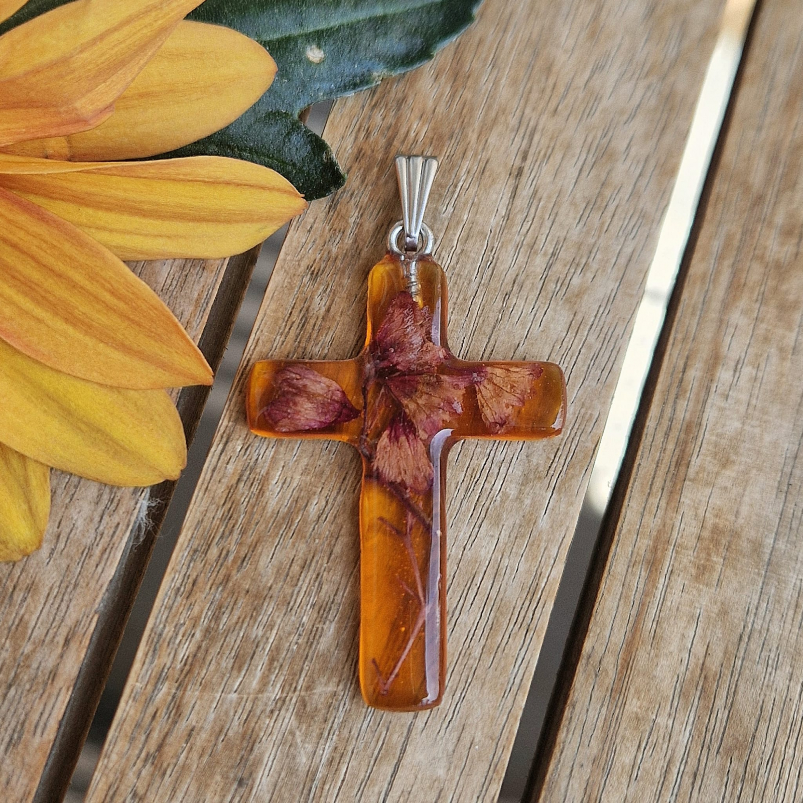 Acest pandantiv unic, realizaț manual, surprind frumusețea pură a naturii. Detaliile fermecătoare ale plantelor naturale încorporate în rășină dau viață acestei bijuterii fine, în timp ce rășina rezistentă la UV asigură păstrarea culorilor și prospețimii florii. Oțelul inoxidabil garantează durabilitatea cerceilor, fiind ușor de purtat atât zi de zi, cât și la ocazii speciale, atunci când dorești să-ți evidențiezi stilul apropiat de natură. Oțelul inoxidabil este un material extrem de durabil, hipoalergenic, rezistent la coroziune și își păstrează strălucirea, ceea ce îl face o alegere excelentă pentru bijuterii pe termen lung.