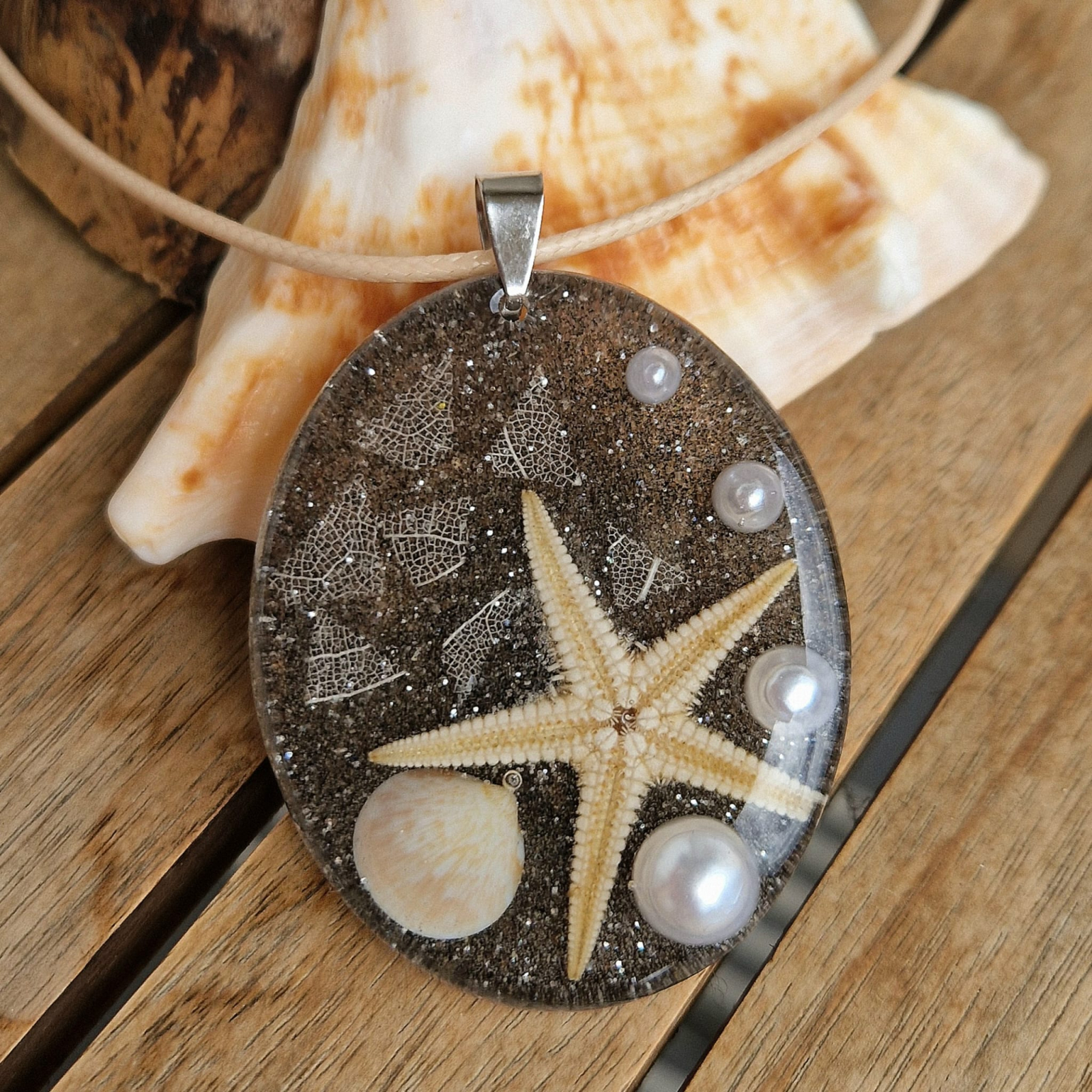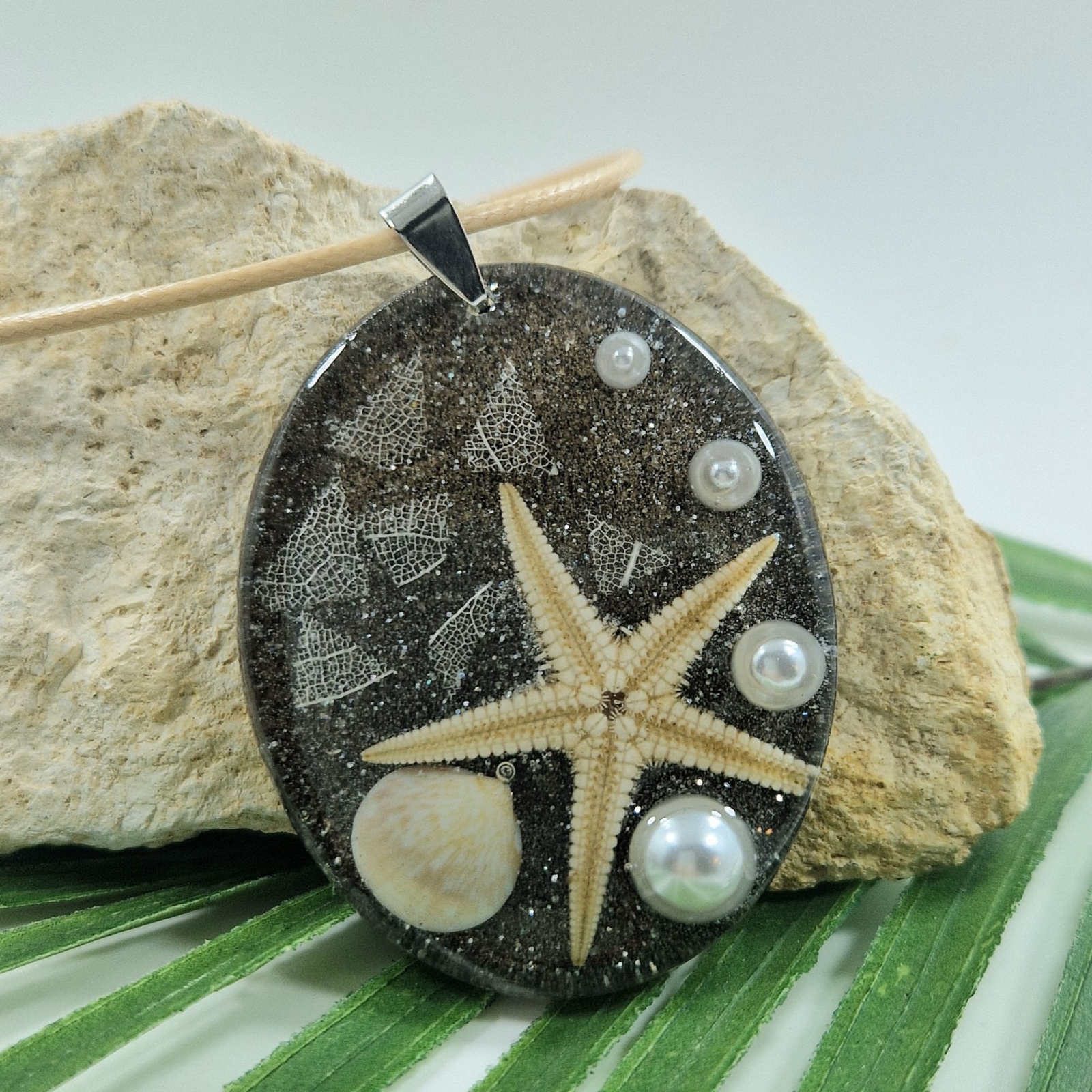 Rășină rezistentă la UV, stele de mare și scoici reale, mărgele din sticlă, nisip negru, oțel inoxidabil (pandantiv), șnur cerat + aliaj metalic (colier) – materiale naturale, durabile și prietenoase cu pielea.