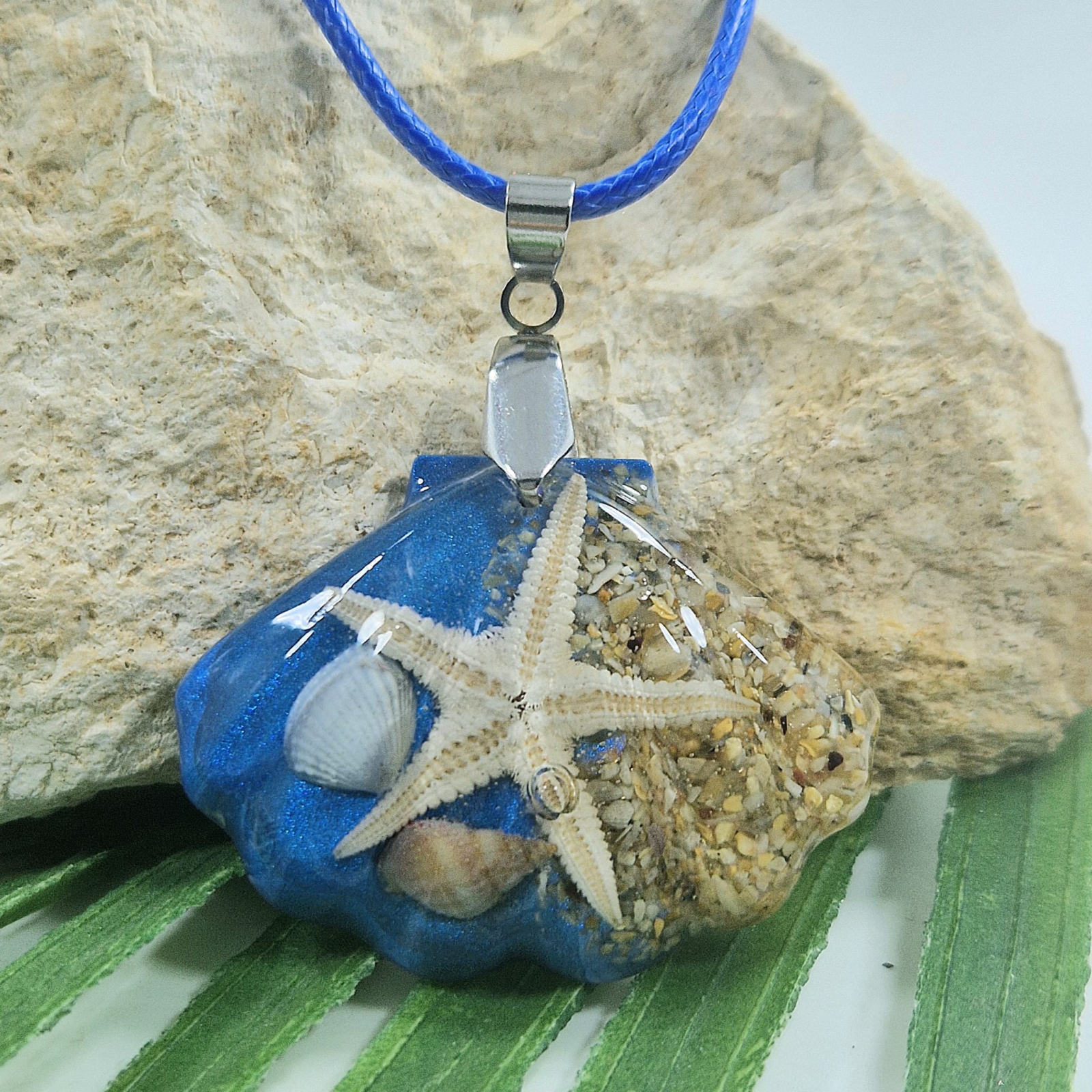 Acest pandantiv unic, realizaț manual, aduce la tine farmecul ascuns al mării. Comori marine autentice au fost încapsulate în rășina cristalină, rezistentă la UV, astfel încât să poți purta cu tine minunile din adâncurile mării. Fiecare detaliu evocă valurile, albastrul profund și lumea specială a oceanului.