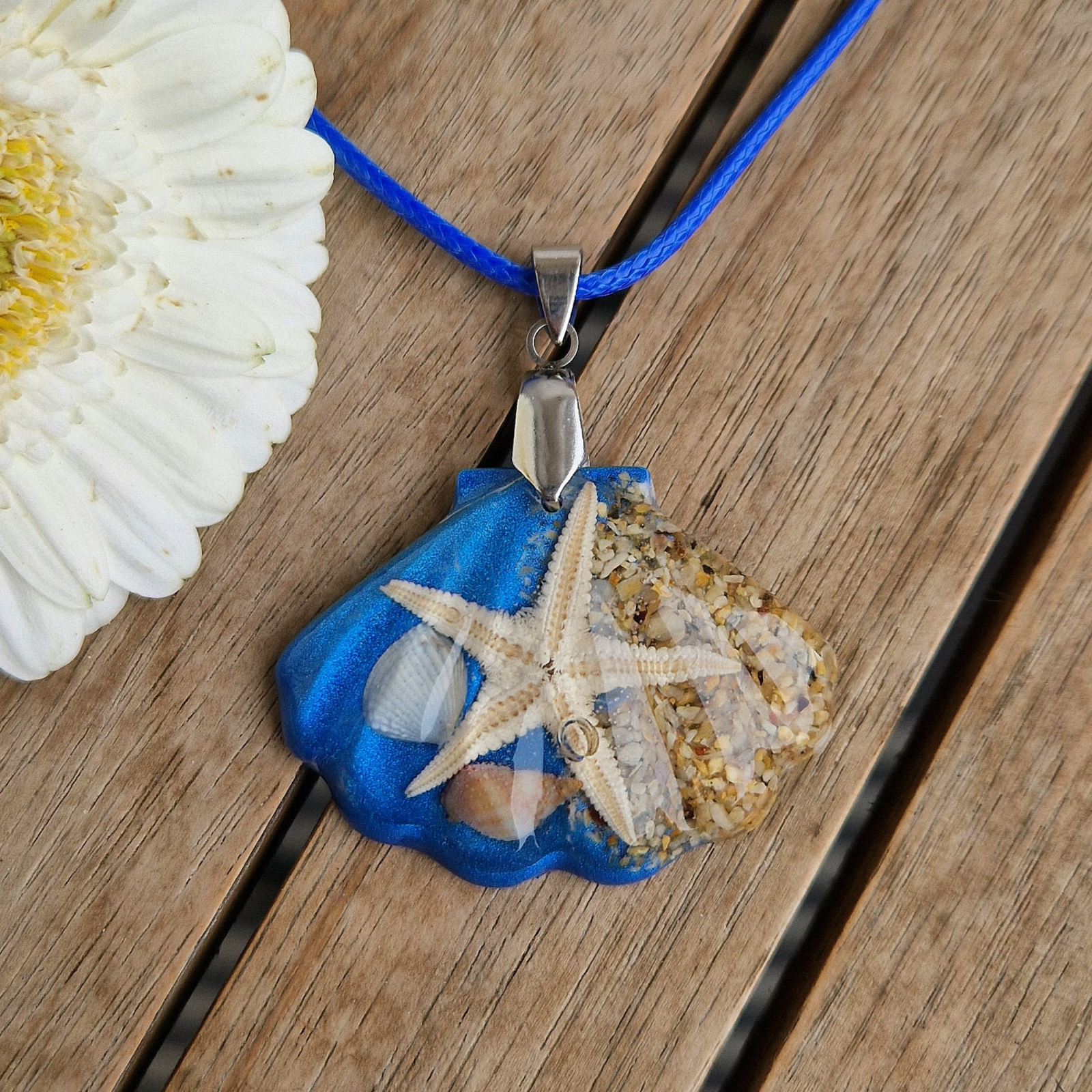 Rășină rezistentă la UV, stele de mare reale, mărgele din sticlă, nisip, oțel inoxidabil (pandantiv), șnur cerat + aliaj metalic (colier) – materiale naturale, durabile și prietenoase cu pielea.