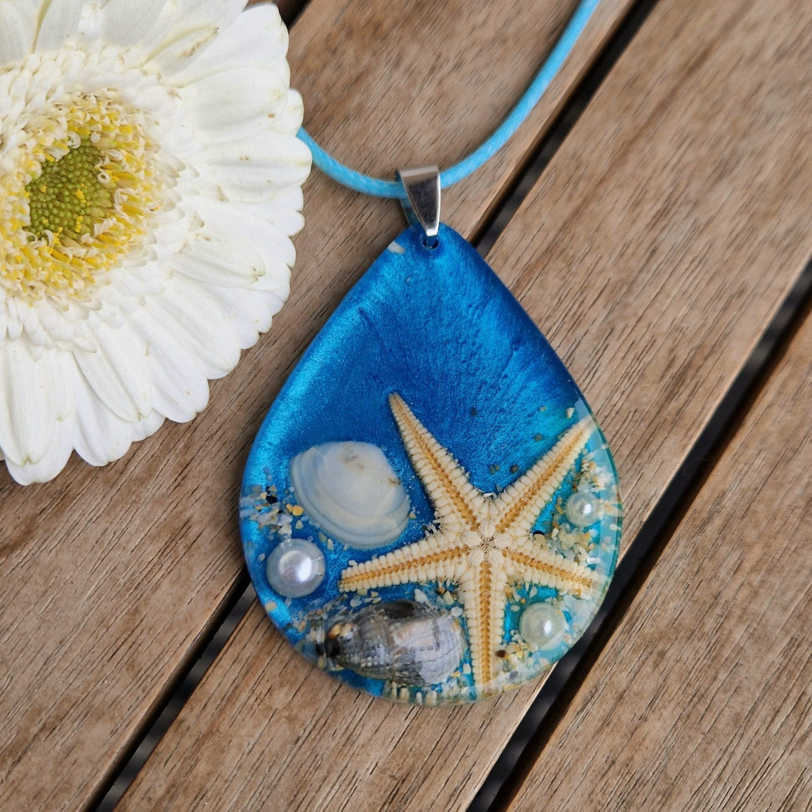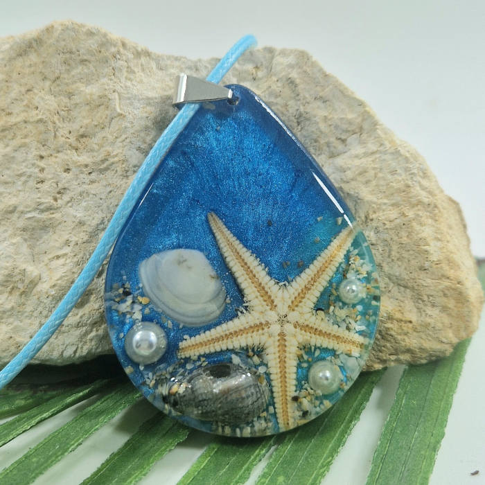 Rășină rezistentă la UV, stele de mare reale, mărgele din sticlă, nisip, oțel inoxidabil (pandantiv), șnur cerat + aliaj metalic (colier) – materiale naturale, durabile și prietenoase cu pielea.
