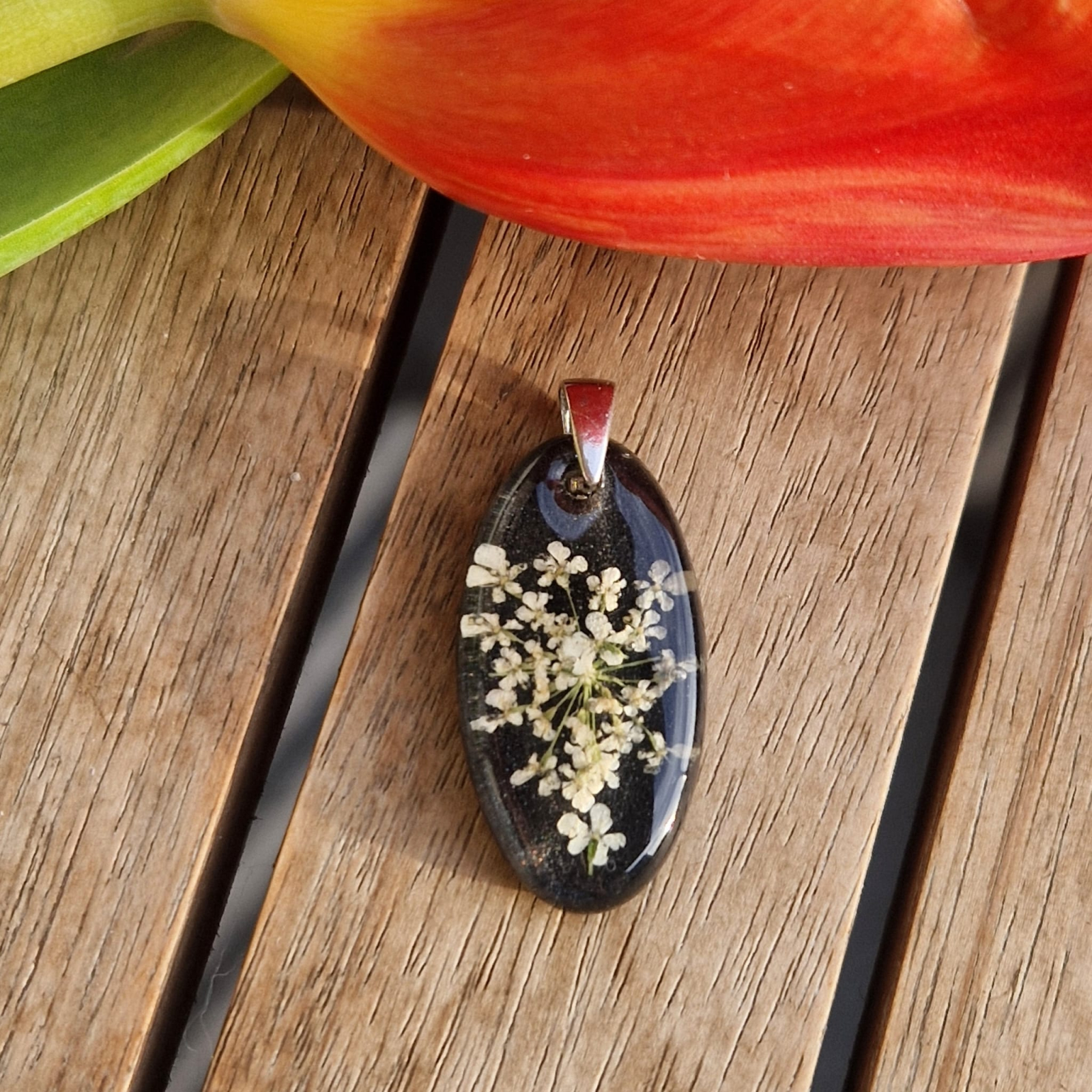 • Materiale utilizate: Rășină rezistentă la UV, flori de morcov uscată, argint 925  – Materiale nobile și durabile pentru o frumusețe de lungă durată.