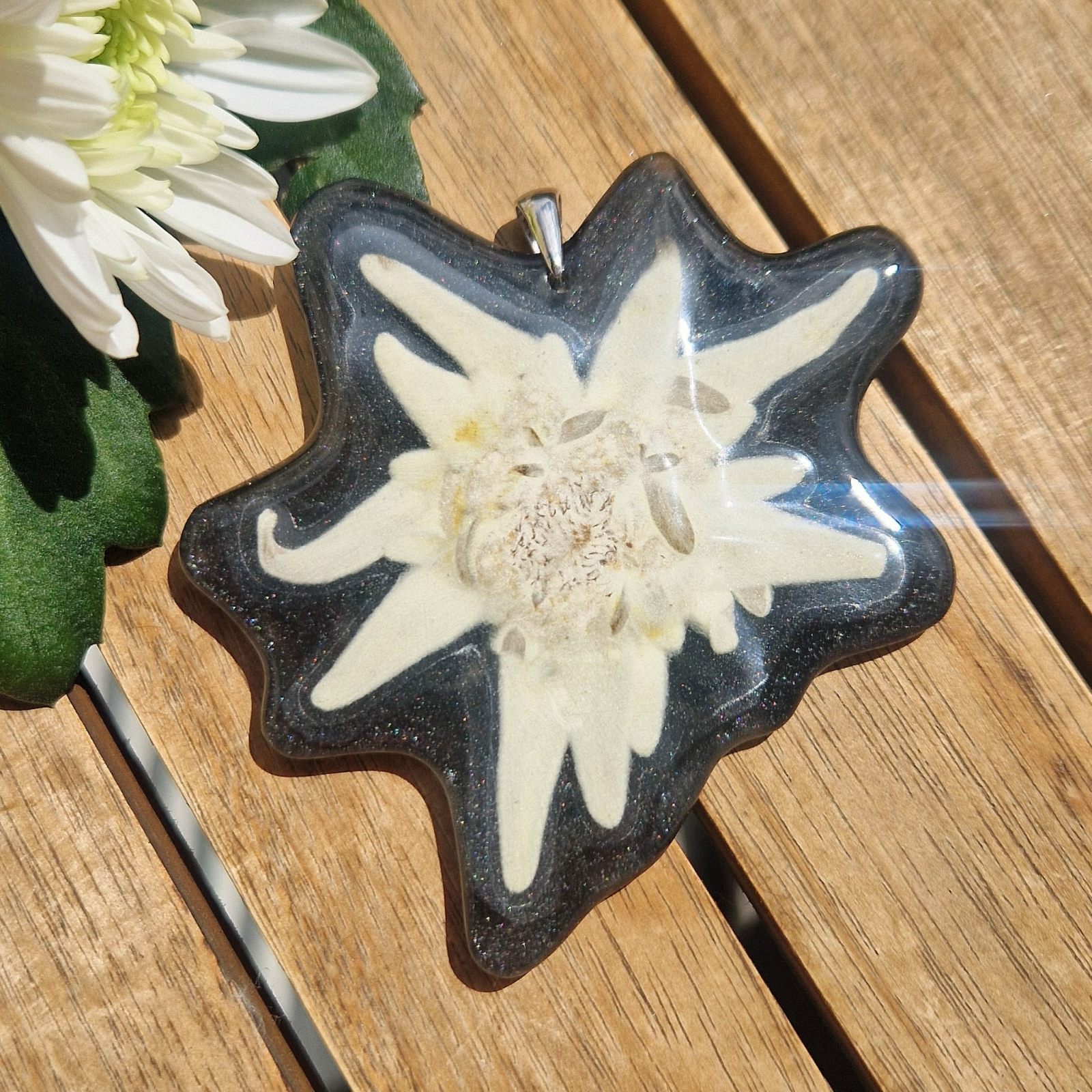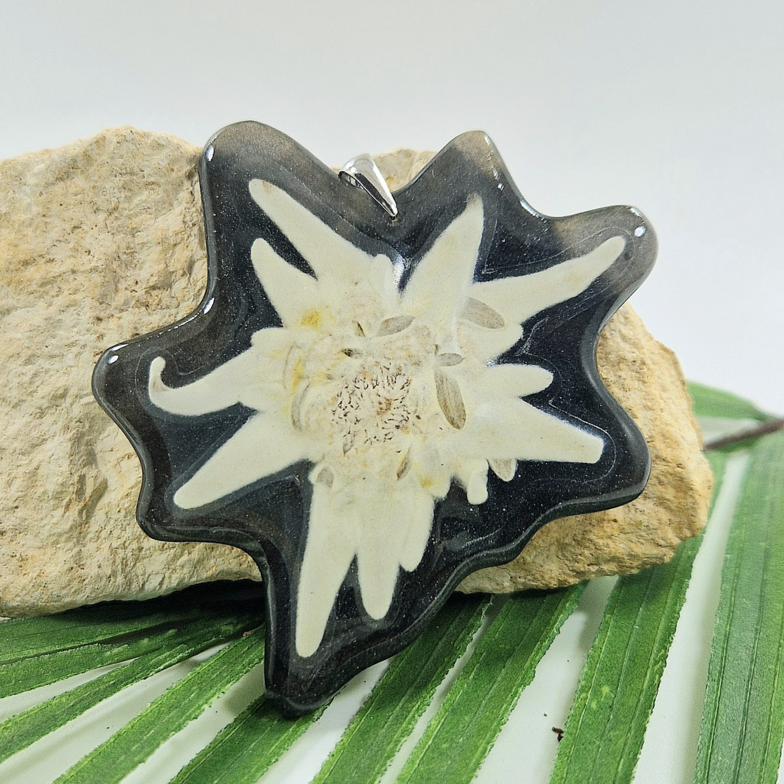 • Materiale utilizate: Rășină rezistentă la UV, floare de colț uscată, argint 925  – Materiale nobile și durabile pentru o frumusețe de lungă durată.