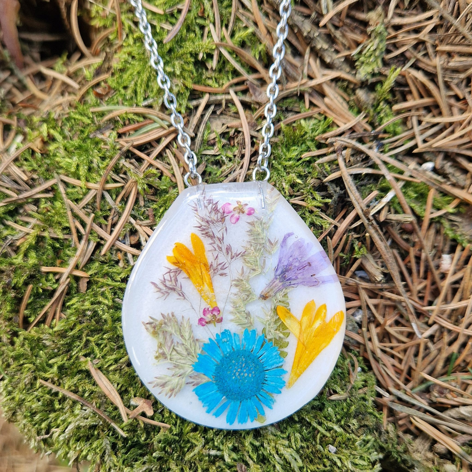 - Felhasznált anyagok: UV-álló gyanta, mezei virág, rozsdamentes acél – Természetes, tartós és bőrbarát anyagok.
