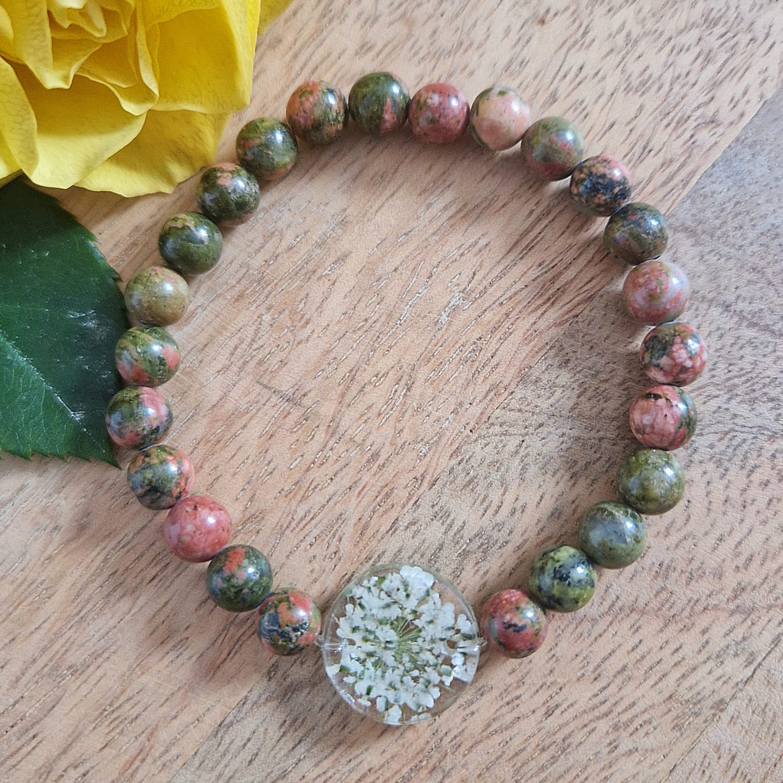 🌿 Az egyensúly és megújulás köve – Unakit ásványból készült karkötő, a természet érintésével