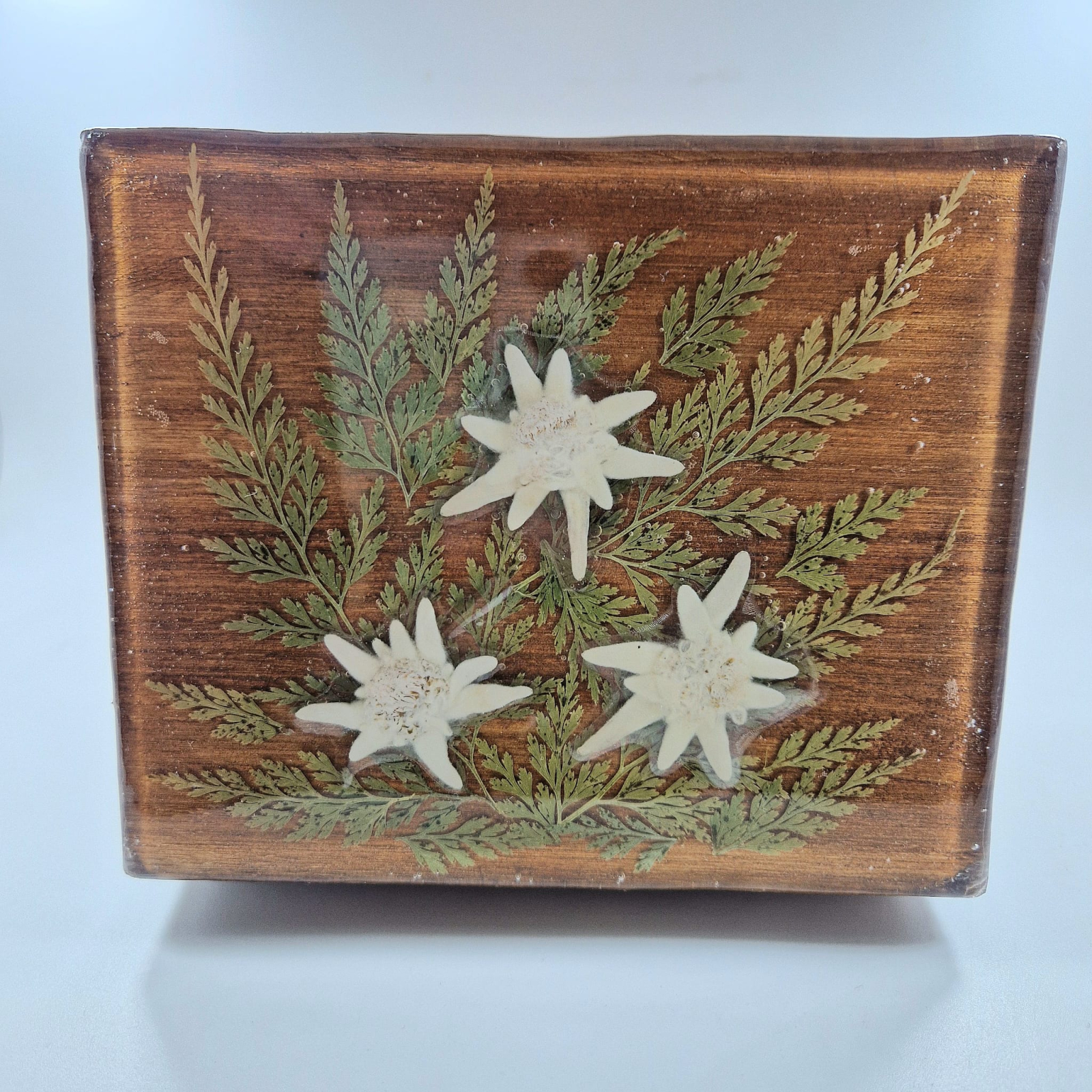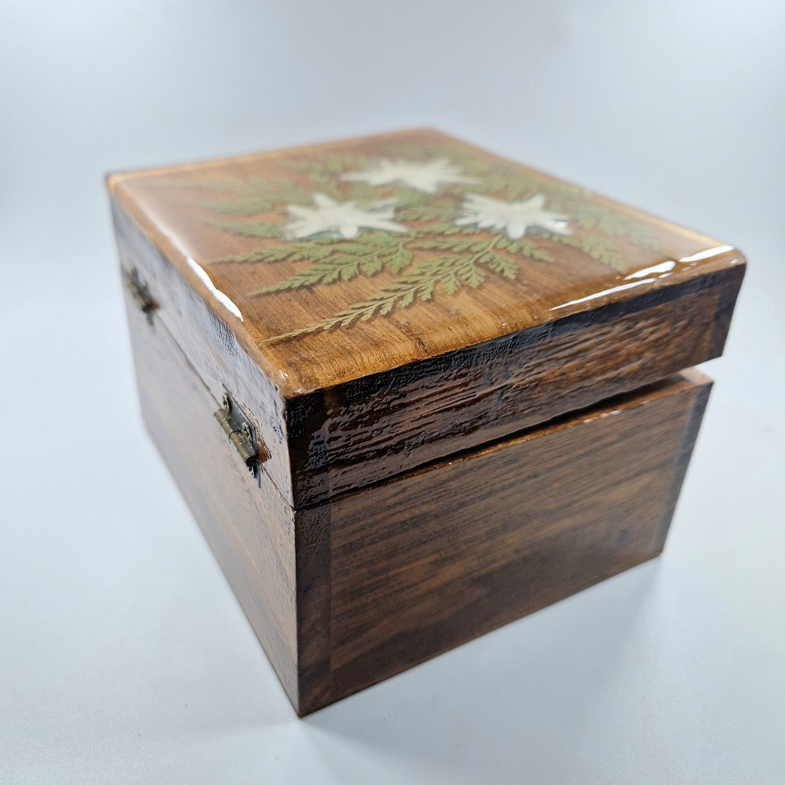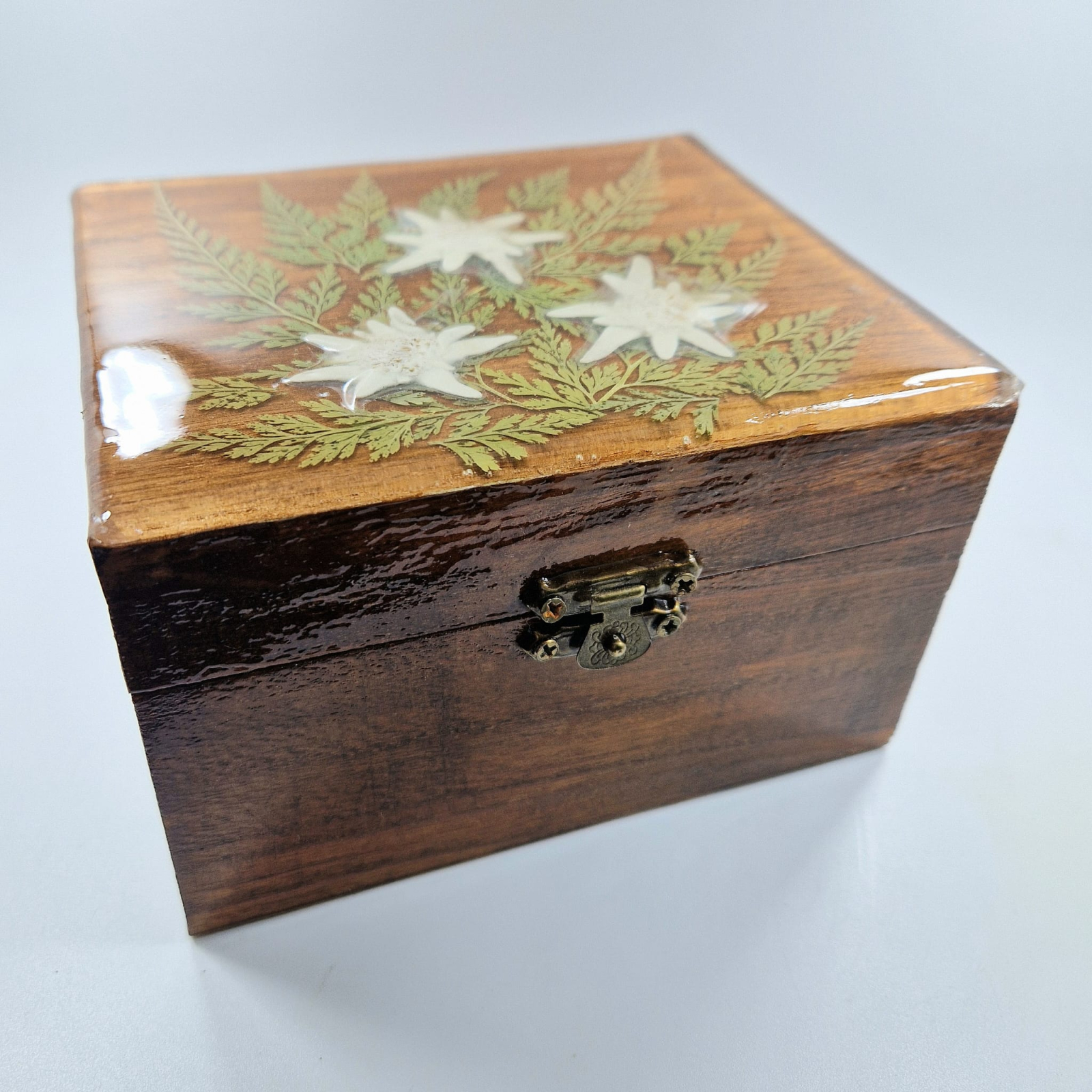 Ez a különleges, kézzel készített fa ékszerdoboz igazi meghívás a természet csodáinak felfedezésére. A doboz tetejét valódi havasi gyopár és páfrány díszíti, melyeket kristálytiszta, UV-álló gyanta réteg véd és örökít meg. Az áttetsző gyanta nemcsak kiemeli a növények finom részleteit, hanem tartósságot is biztosít, így a doboz sokáig megőrzi szépségét.