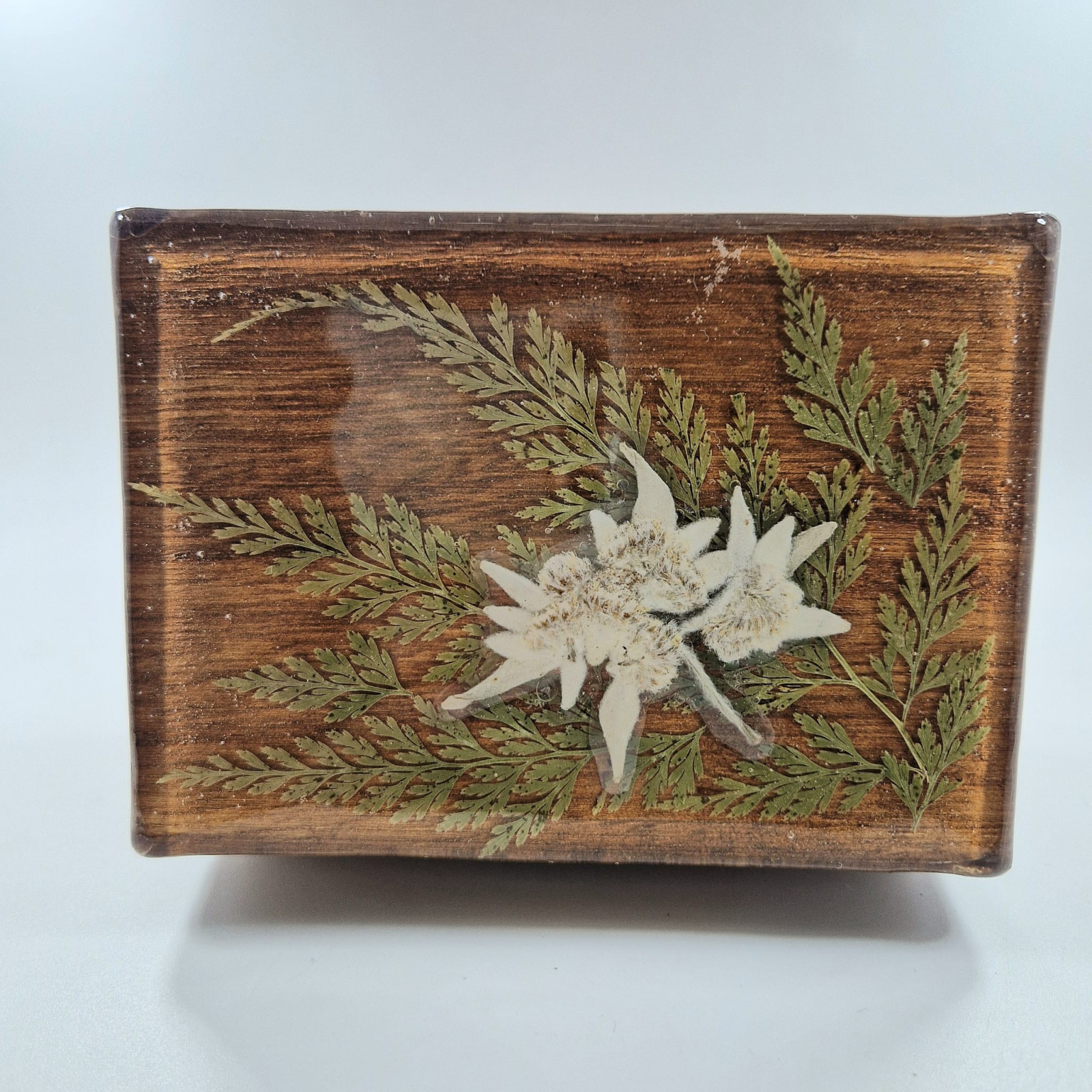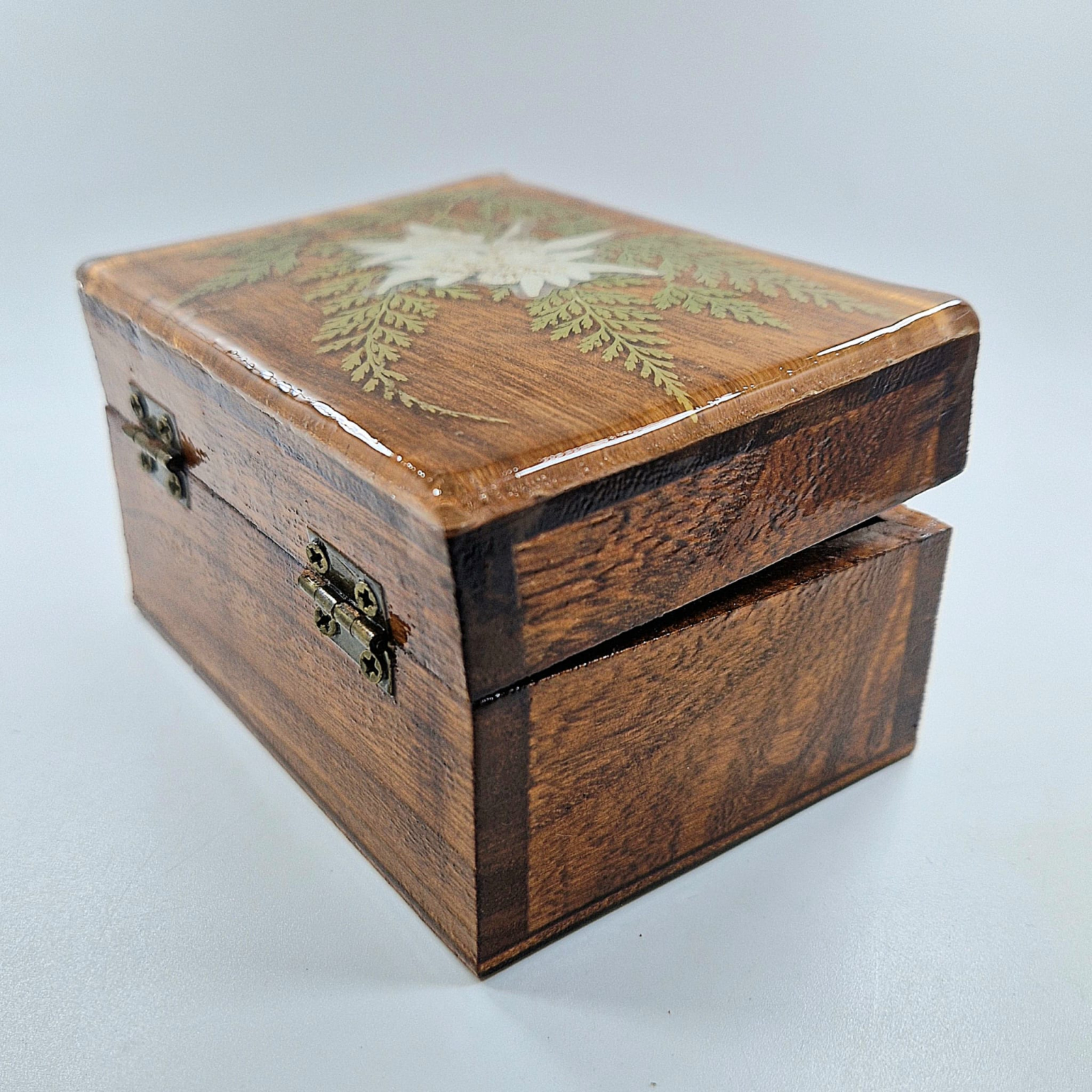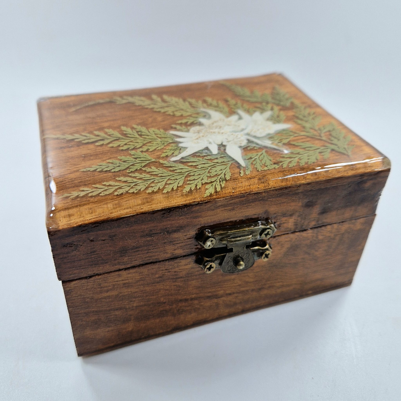 Ez a különleges, kézzel készített fa ékszerdoboz igazi meghívás a természet csodáinak felfedezésére. A doboz tetejét valódi havasi gyopár és páfrány díszíti, melyeket kristálytiszta, UV-álló gyanta réteg véd és örökít meg. Az áttetsző gyanta nemcsak kiemeli a növények finom részleteit, hanem tartósságot is biztosít, így a doboz sokáig megőrzi szépségét.