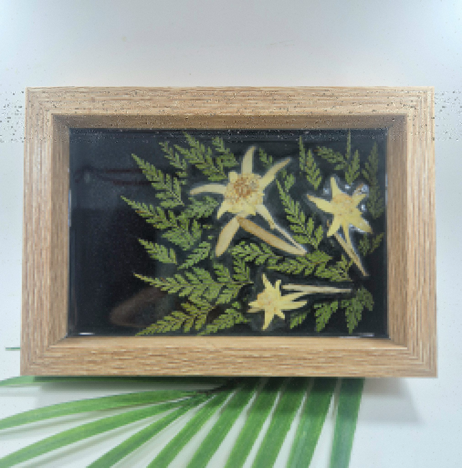 🪵 Anyag: préselt fa keret, UV-álló gyanta, természetes növényi elemek