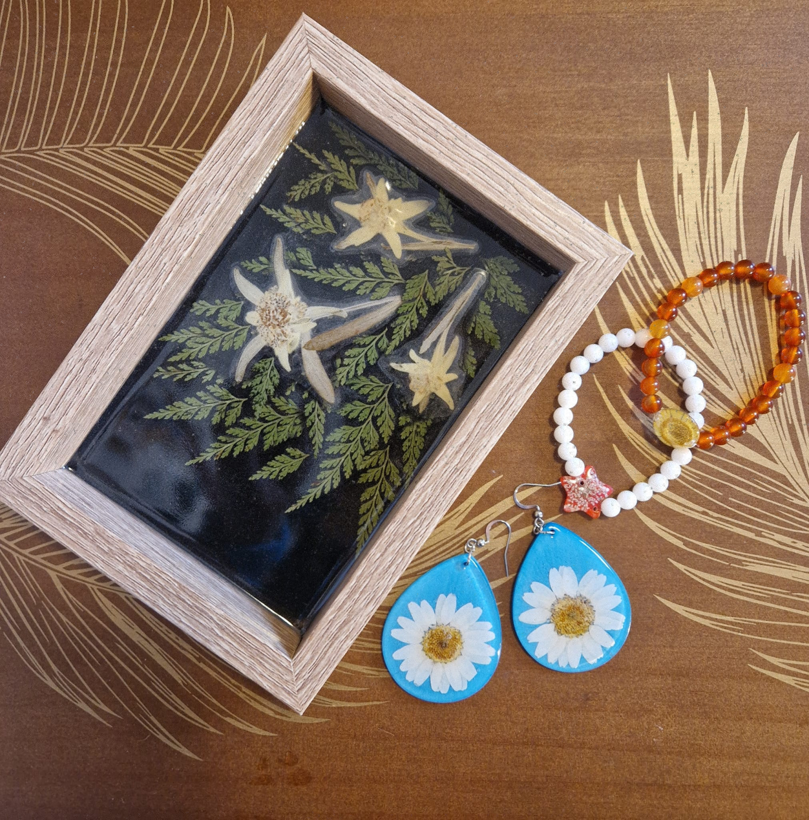 Ez a kézzel készült, egyedi ékszertartó tálca valódi havasi gyopárt és páfrányleveleket rejt, melyek harmonikusan ötvöződnek a természet ihlette dizájnnal. A virágokat és leveleket áttetsző, UV-álló gyanta védi és emeli ki, így a tálca nemcsak praktikus, de egyben különleges dekoráció is.