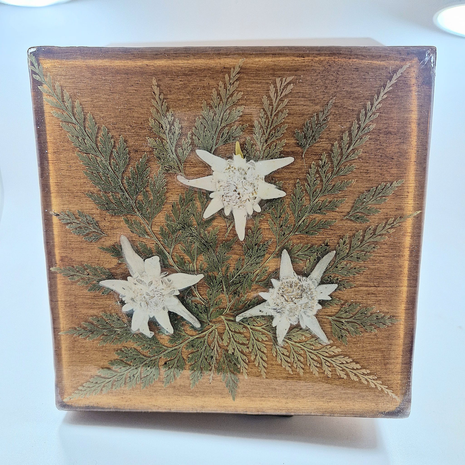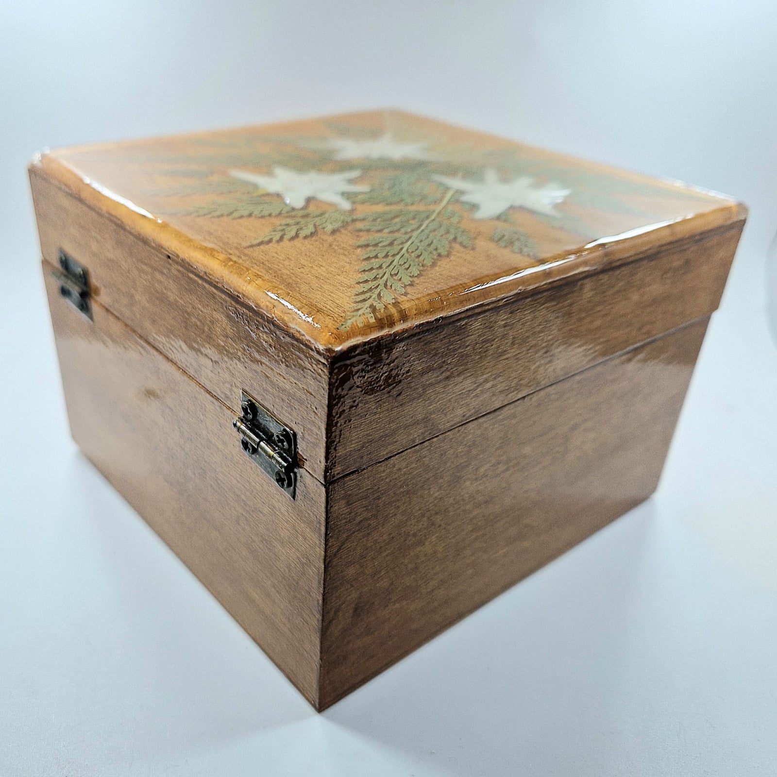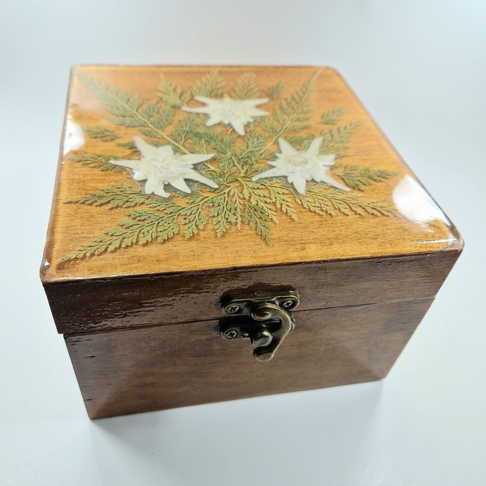 Ez a különleges, kézzel készített fa ékszerdoboz igazi meghívás a természet csodáinak felfedezésére. A doboz tetejét valódi havasi gyopár és páfrány díszíti, melyeket kristálytiszta, UV-álló gyanta réteg véd és örökít meg. Az áttetsző gyanta nemcsak kiemeli a növények finom részleteit, hanem tartósságot is biztosít, így a doboz sokáig megőrzi szépségét.
