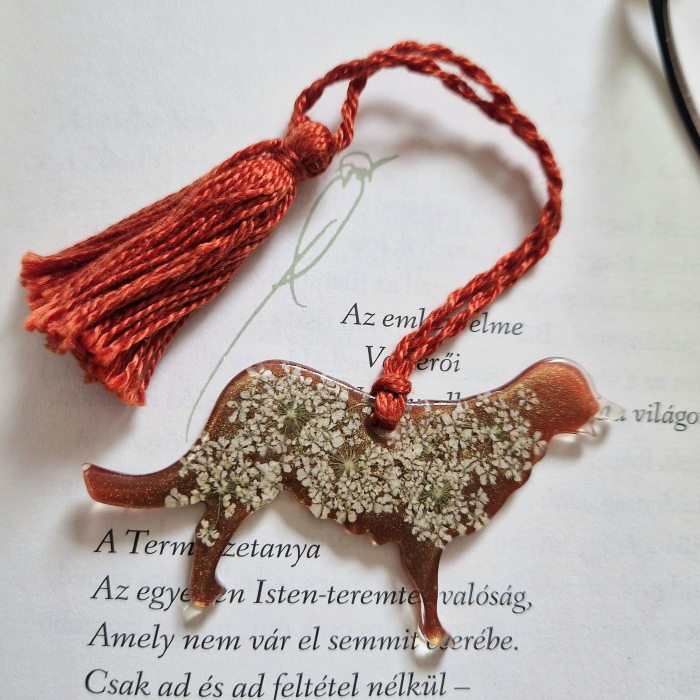 Ez a kézzel készült könyvjelző a természet finomságát ötvözi a modern gyanta tartósságával, így még különlegesebbé teszi az olvasás élményét. A központi elem természetes virágokat és növényeket rejt, melyeket kristálytiszta, UV-álló gyanta őriz meg, így szépségük és apró részleteik hosszú időn át megmaradnak.