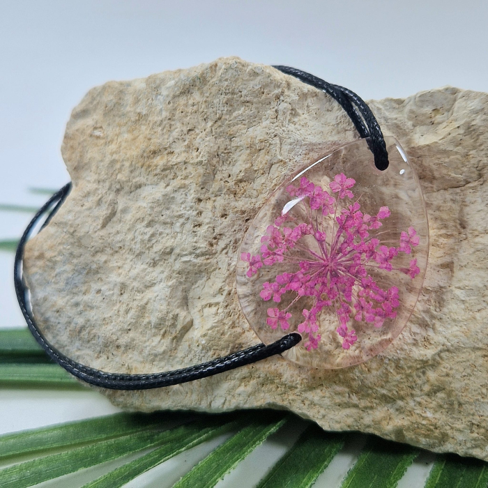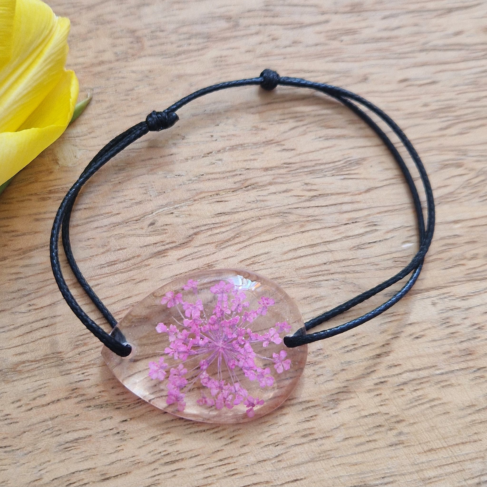 Ez a kézzel készült karperec a természet varázsát és a modern gyanta technológiát ötvözi, hogy egy egyedi és lenyűgöző ékszert hozzon létre. A virágok gyönyörű részleteit UV-álló gyanta védi, amely garantálja, hogy az élénk színek és a virágok természetes szépsége megmaradjon. Az állítható hosszúságú zsineg, hogy a karperec kényelmesen illeszkedjen a csuklódra, és tartós legyen.