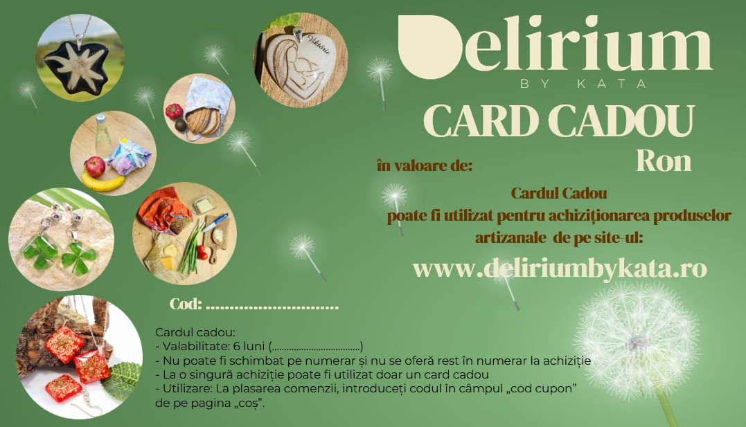Ha nem tudod, mit vásárolj, itt egy tökéletes ötlet: ajándékutalvány a www.deliriumbykata.ro weboldalra, melyet a választott összeggel tölthetsz fel. Az ajándékutalvány tulajdonosa kedvére válogathat egyedi ékszerek, kiegészítők és környezettudatos termékek közül.