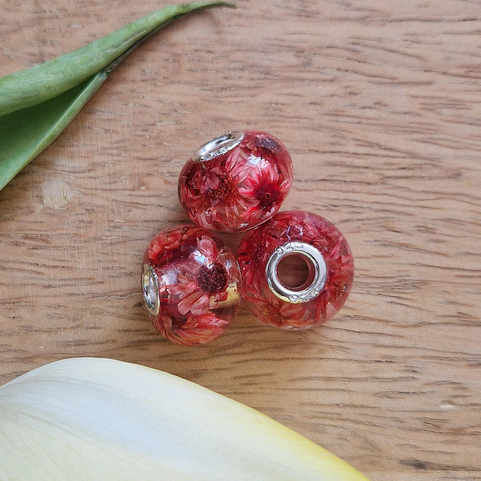 Ez az egyedi, kézzel készült gyöngy finom, nőies és különleges kiegészítője lehet kedvenc karkötődnek. Belsejében színezett szalmavirág kapott helyet, amelyet kristálytiszta, UV-álló gyanta őriz meg. A virág részletei szépen kirajzolódnak a fényben, így minden egyes darab apró, természet ihlette kis világként ragyog.