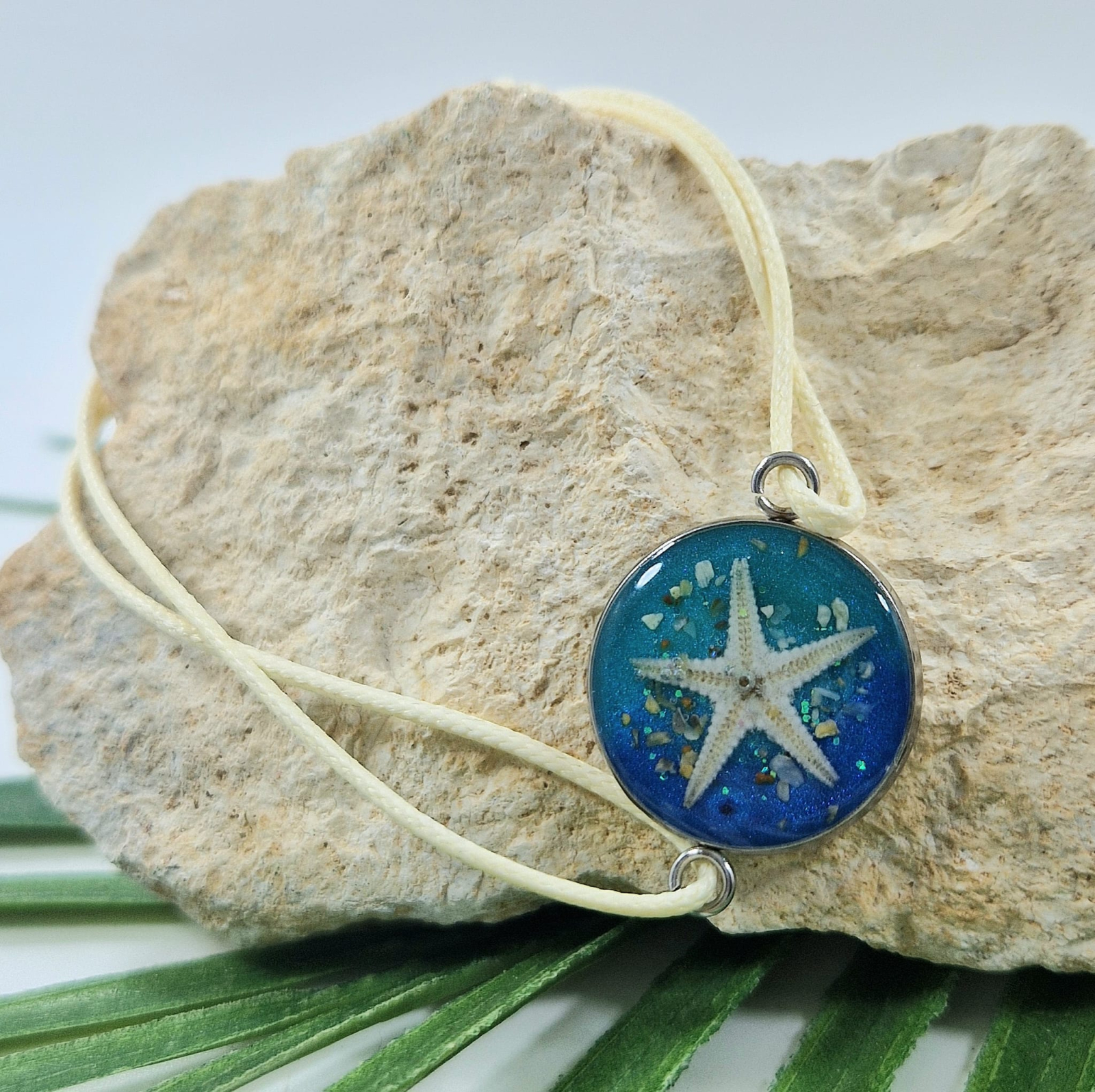 Ez a kézzel készült karkötő a tenger egy apró darabját hozza el egy különleges és finom ékszer formájában. A medál egy apró tengeri csillagot rejt, amelyet kristálytiszta, UV-álló gyanta őriz meg. A gyanta kiemeli a tengeri csillag finom részleteit, miközben hosszú időn át megőrzi annak természetes szépségét.