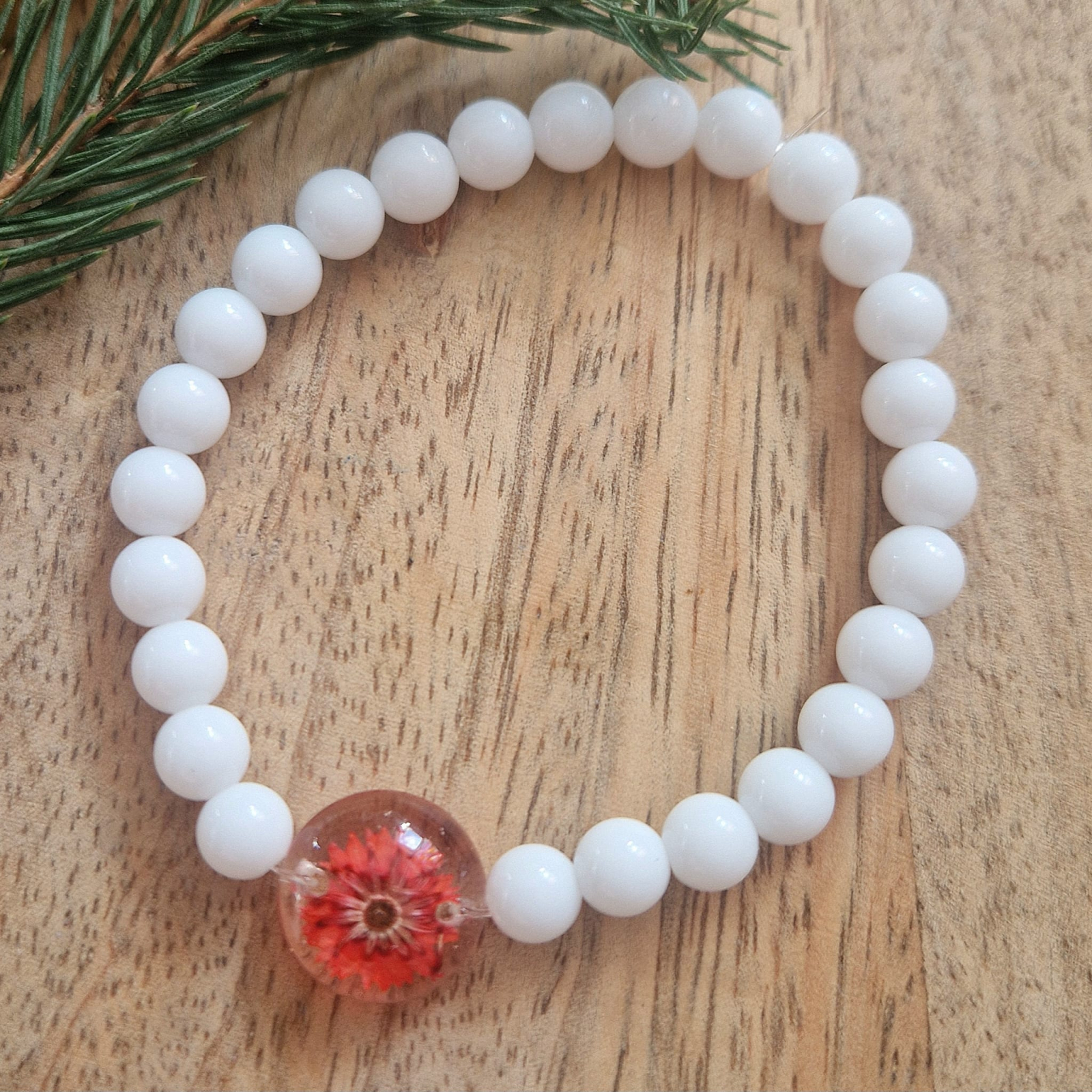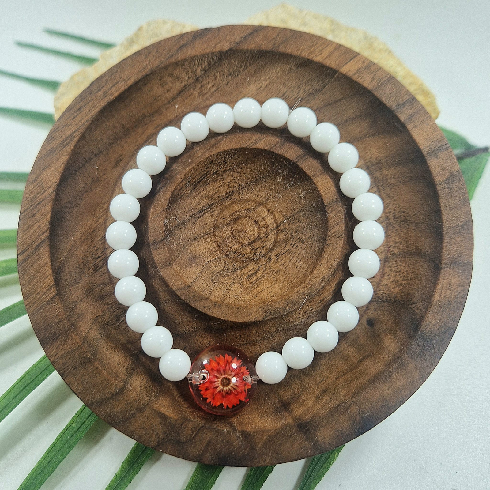 A karkötő központi dísze egy kézzel készült medál igazi virágokkal, amelyeket UV-álló gyantában konzerváltunk. A kristálytiszta gyanta hosszú távon megőrzi a virágok szépségét és élénk színeit, így minden ékszer egyedi és megismételhetetlen.