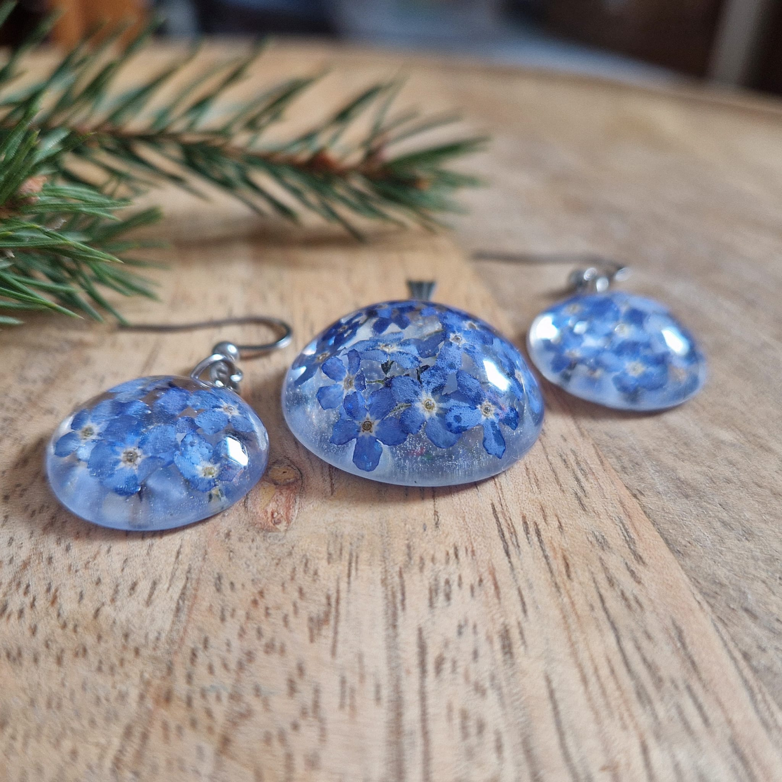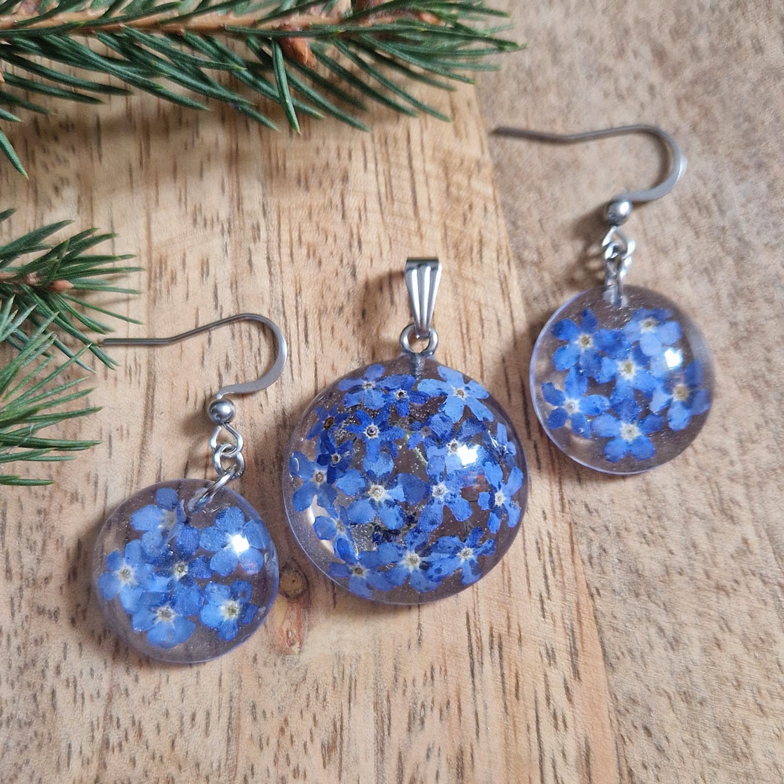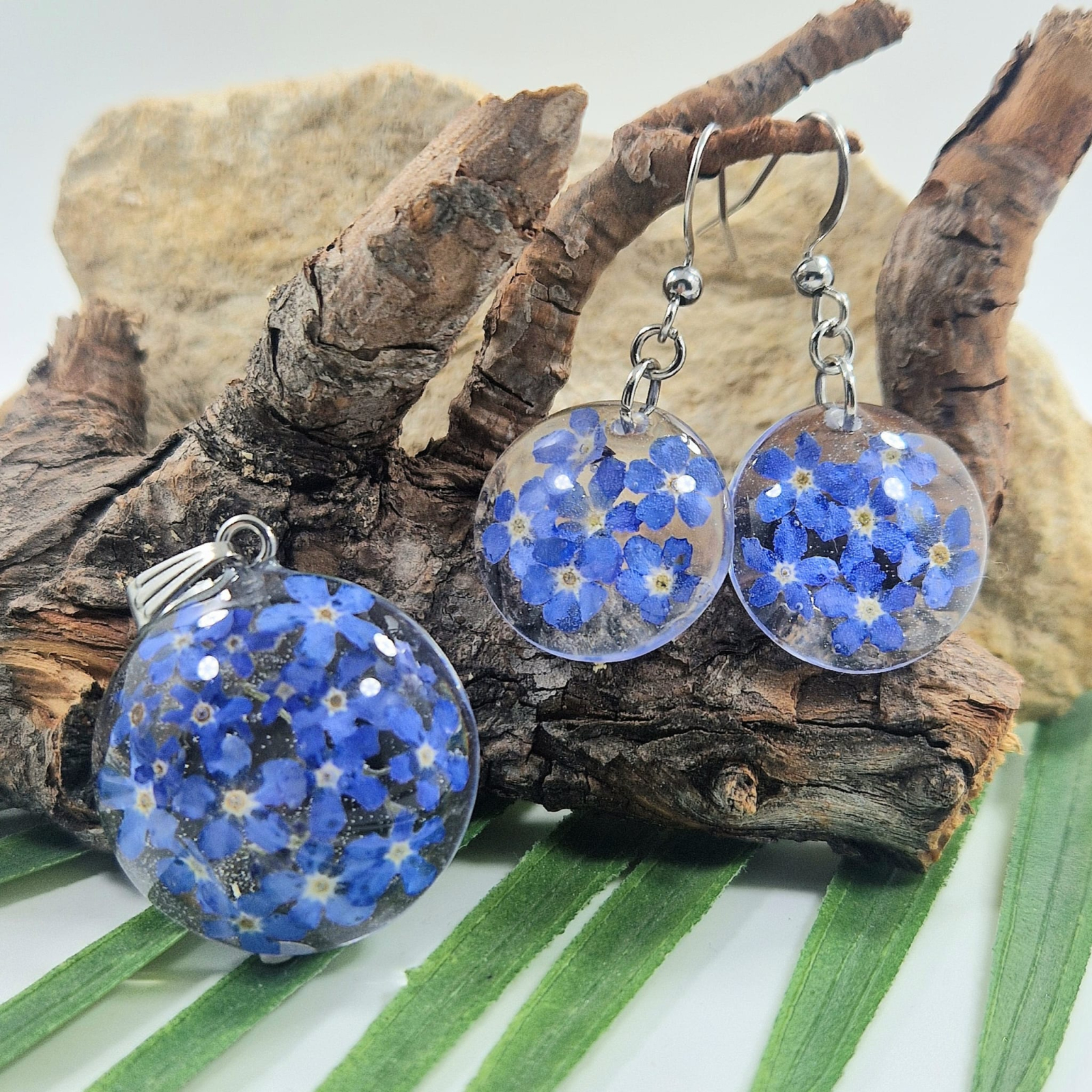 Ez az egyedi ékszer szett gyönyörűen ötvözi a természet csodáit és a modern dizájnt. A szett tartalmaz egy medált és fülbevalót, amelyek mezei virágokkal és kristálytiszta, UV-álló gyantával készültek.