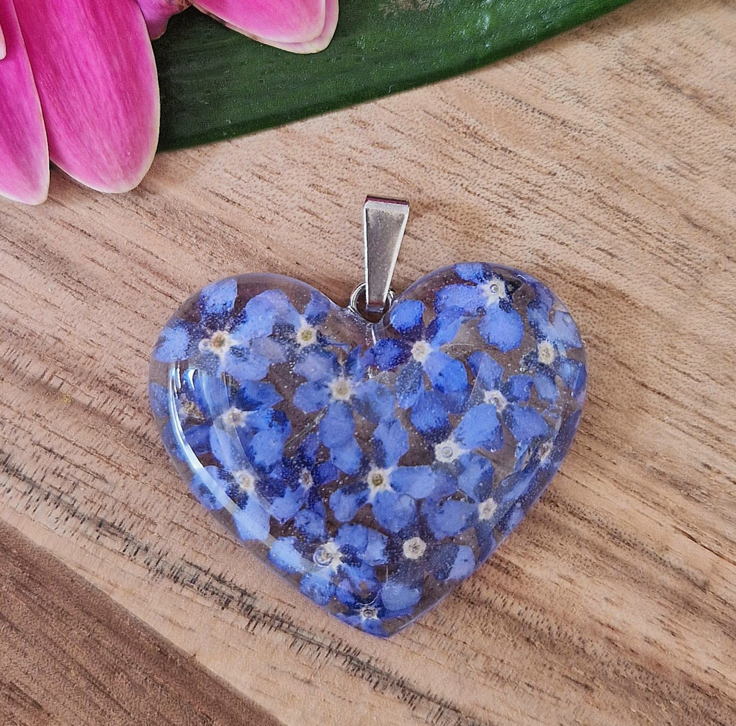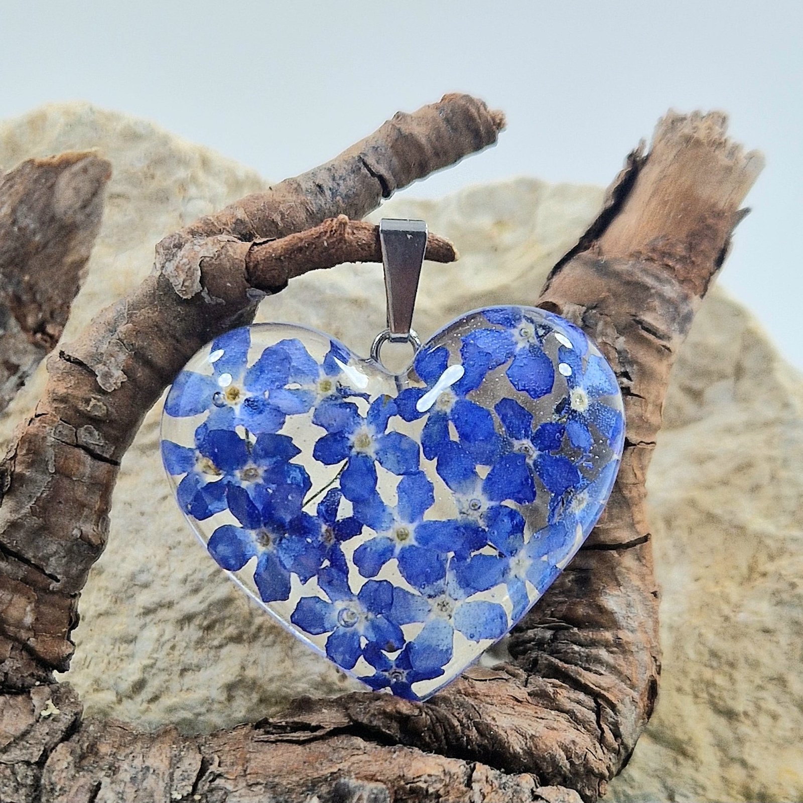 • Felhasznált anyagok: UV-álló gyanta, nefelejcs, rozsdamentes acél – Természetes, tartós és bőrbarát anyagok.