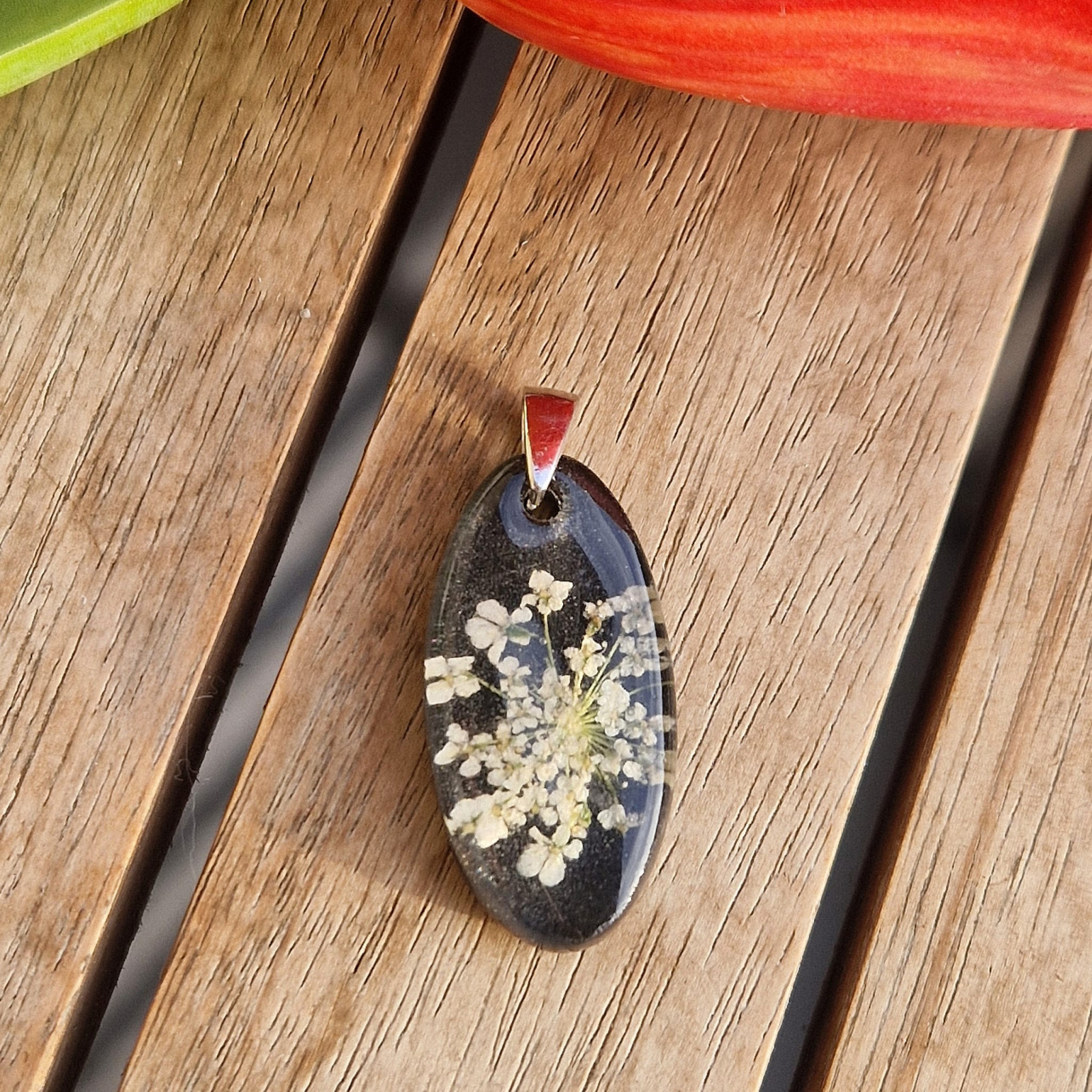 • Felhasznált anyagok: UV-álló gyanta, szárított mezei turbolya,  925-ös tisztaságú ezüst – Nemes és tartós anyagok a hosszantartó szépség érdekében.