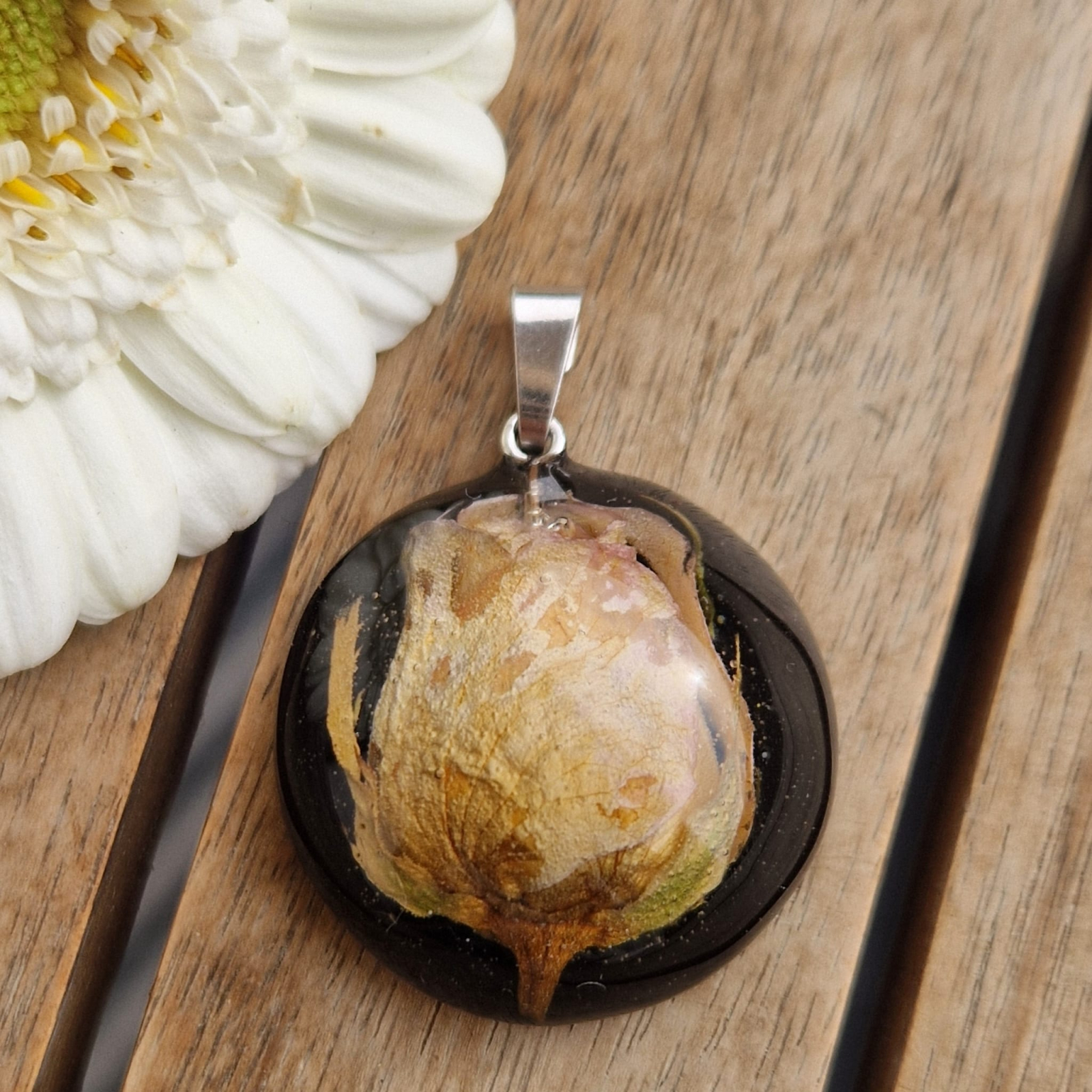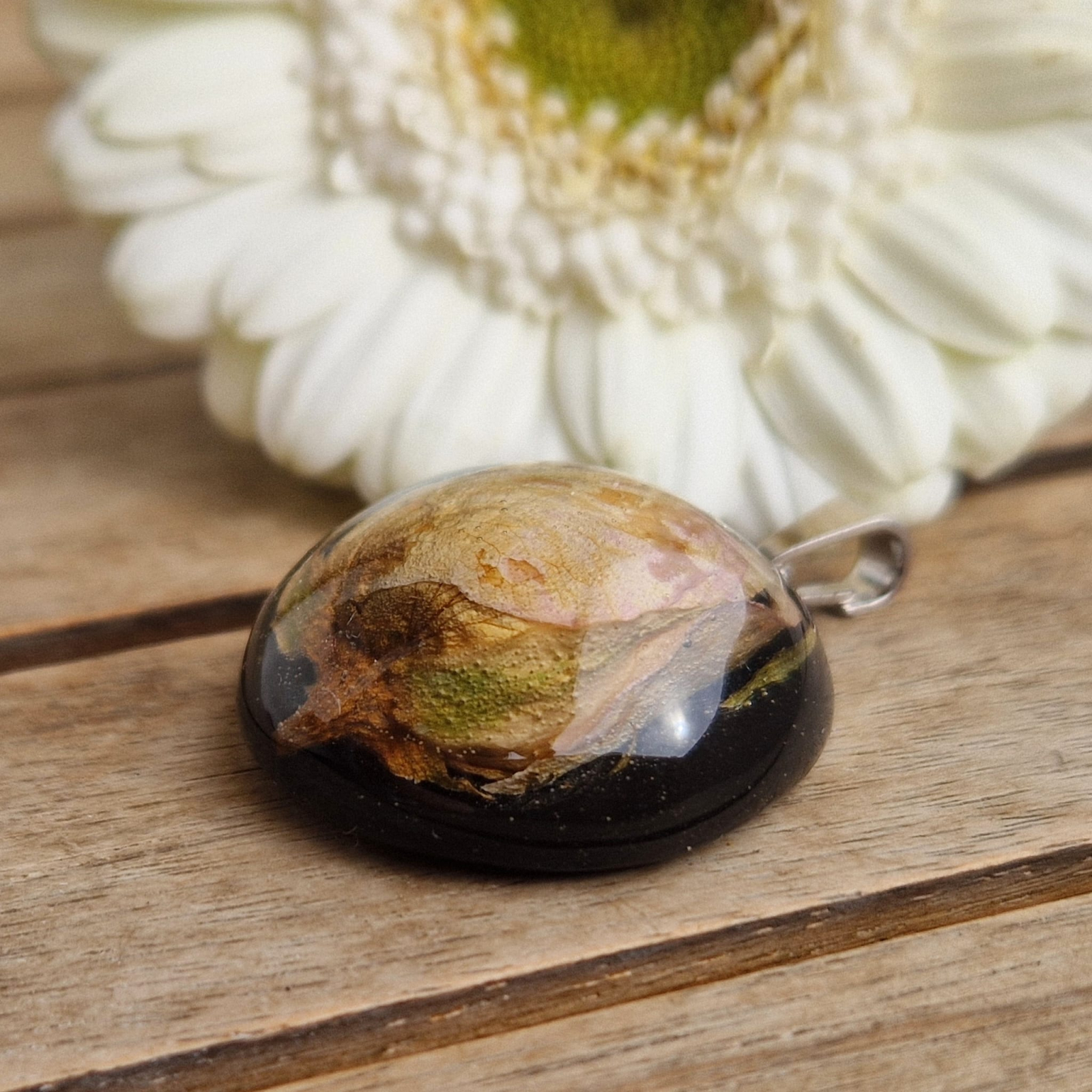• Felhasznált anyagok: UV-álló gyanta, szárított törperózsa, 925-ös tisztaságú ezüst – Nemes és tartós anyagok a hosszantartó szépség érdekében.