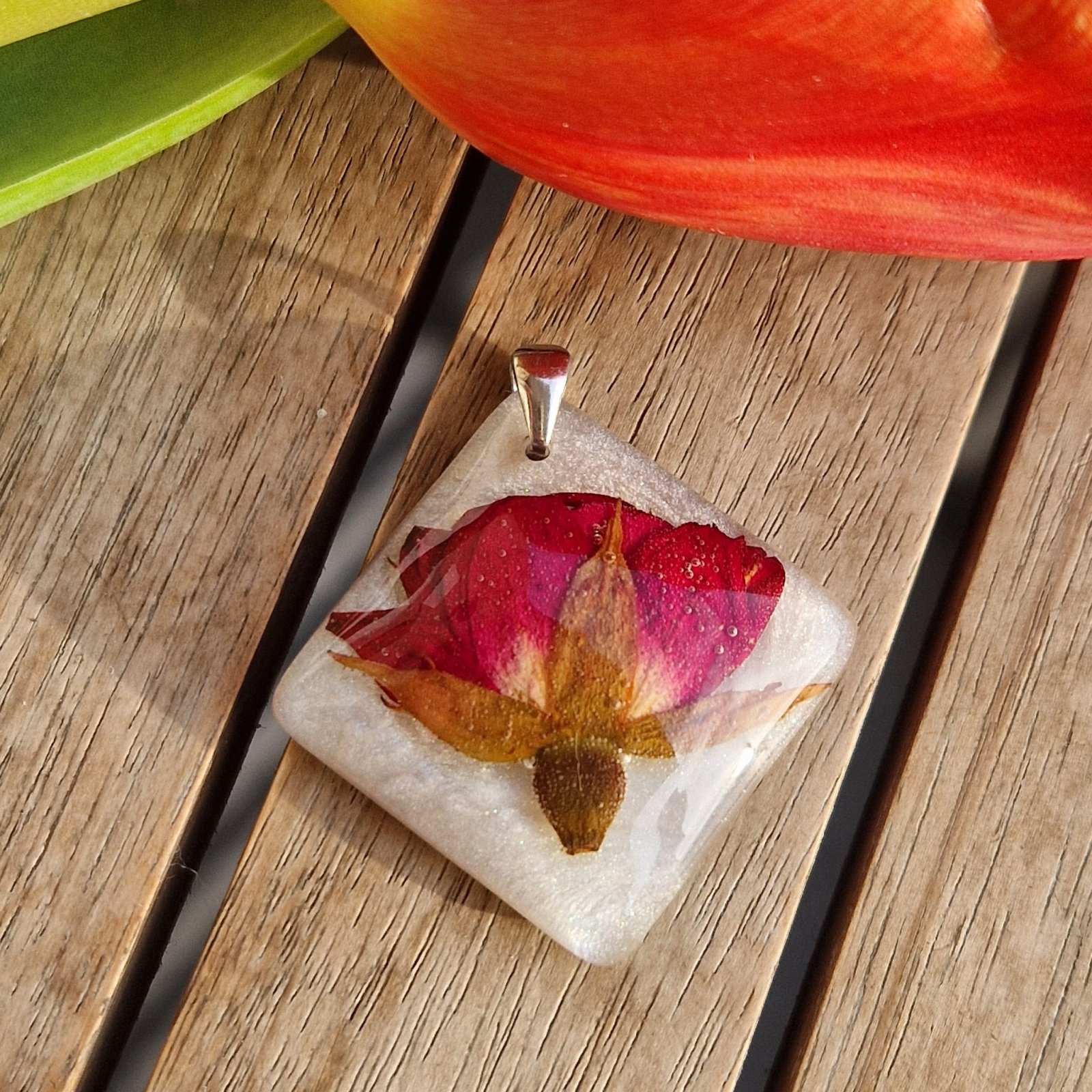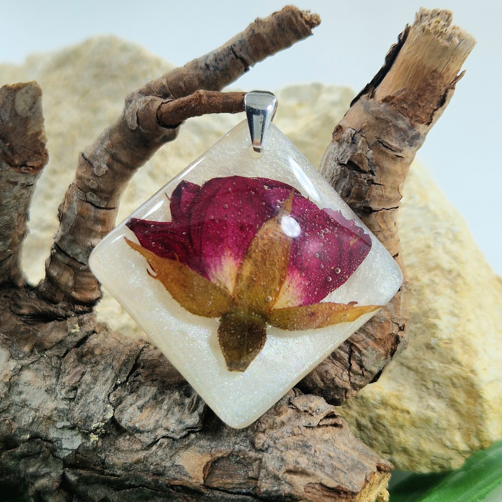 • Felhasznált anyagok: UV-álló gyanta, szárított törperózsa,  925-ös tisztaságú ezüst – Nemes és tartós anyagok a hosszantartó szépség érdekében.
