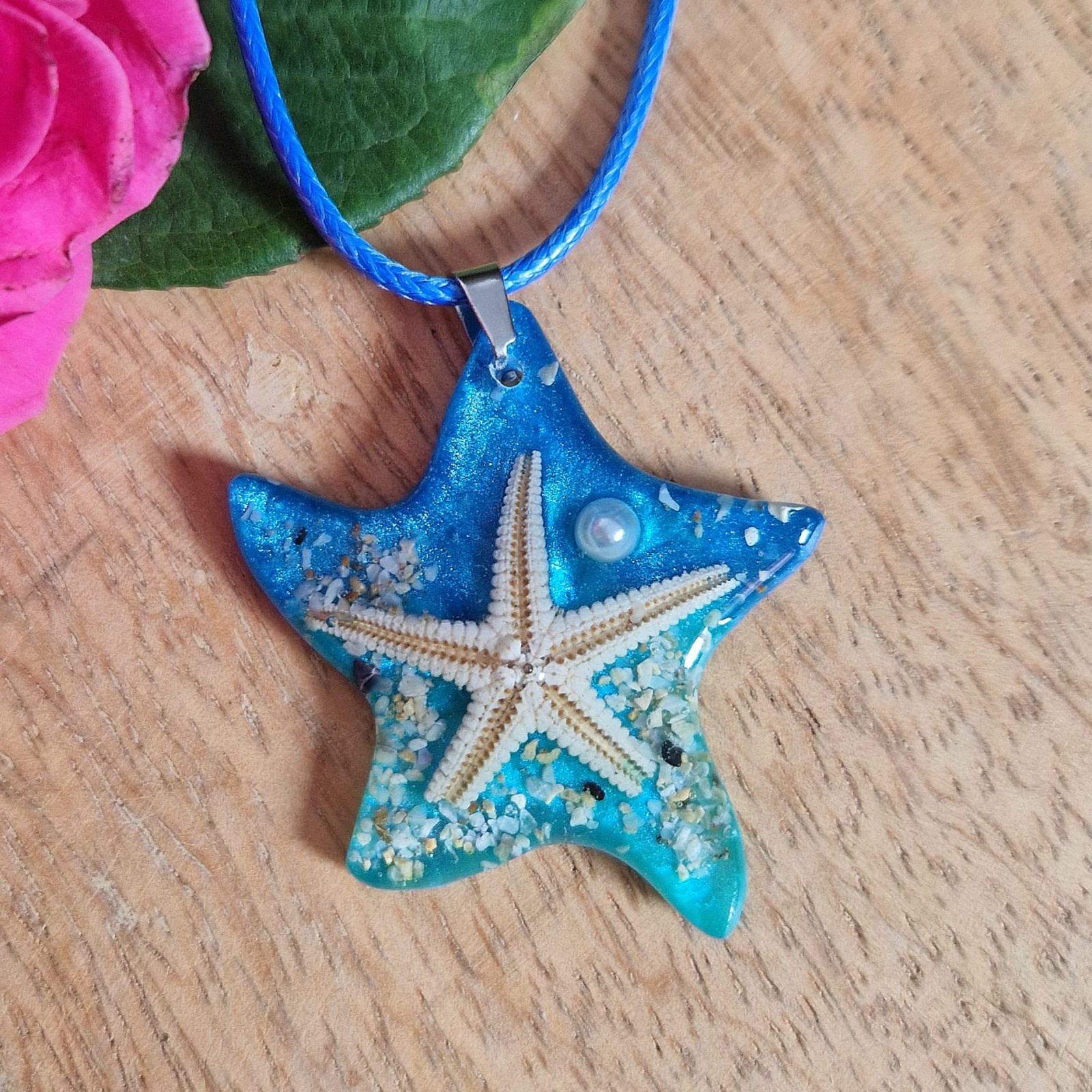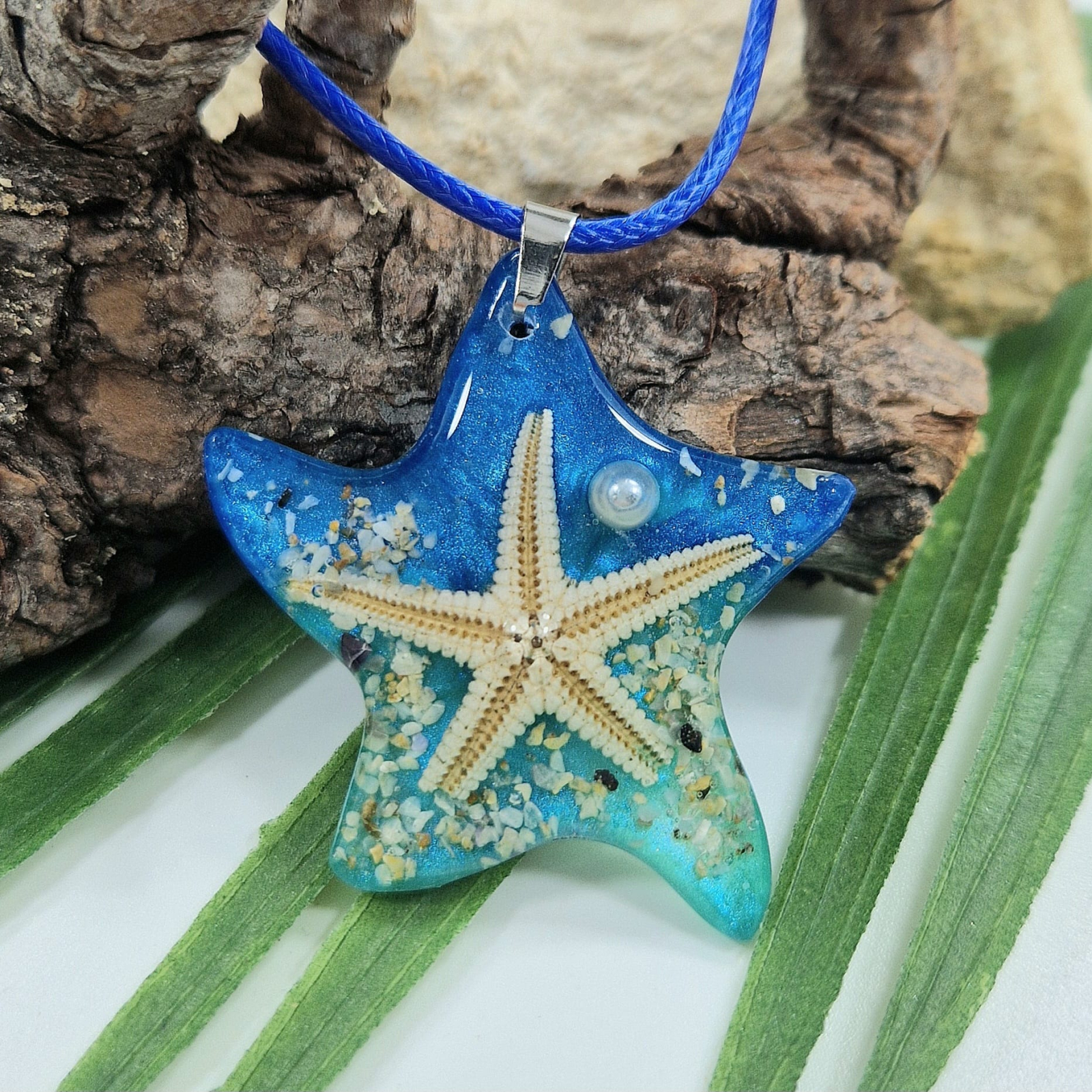 UV-álló gyanta, valódi tengeri csillag, üveg gyöngy, homok, rozsdamentes acél (medál), gyantázott zsinór + fémötvözet (nyaklánc) – természetes, tartós és bőrbarát anyagok.