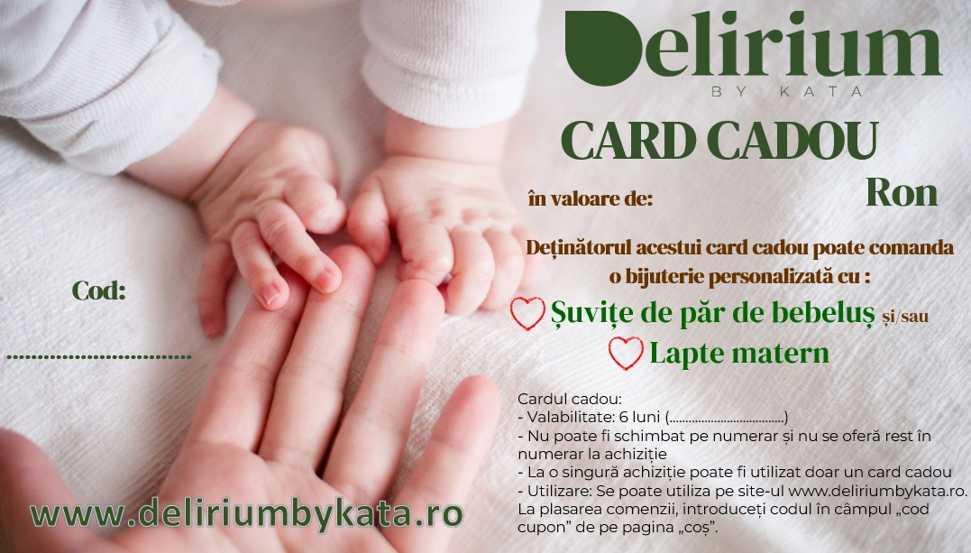 Ha nem tudod, mit vásárolj, itt egy tökéletes ötlet: ajándékutalvány a www.deliriumbykata.ro weboldalra, melyet a választott összeggel tölthetsz fel. Az ajándékutalvány tulajdonosa kedvére válogathat egyedi személyre szabott anyatejes és/vagy babahajas ékszerek közül.