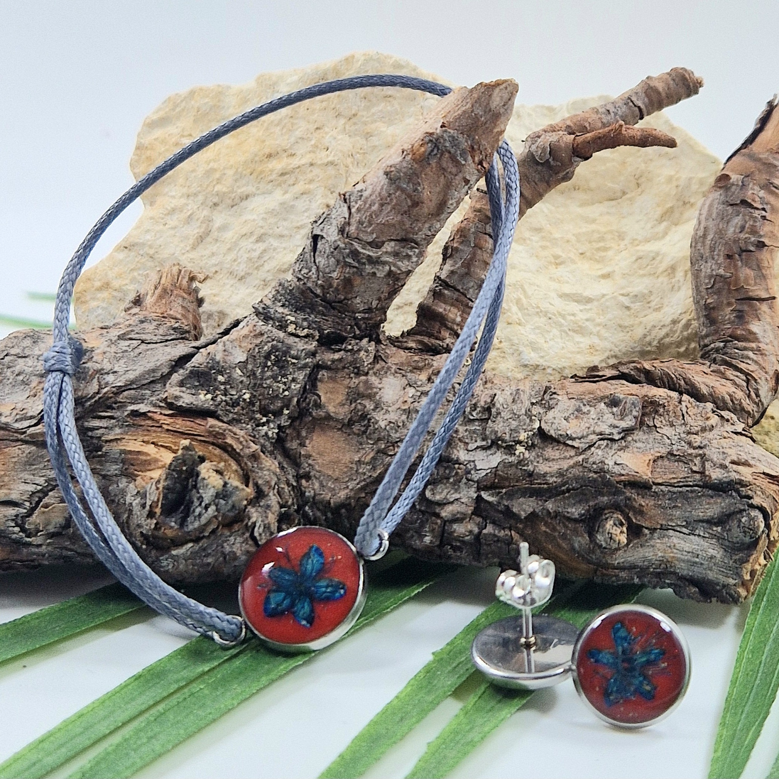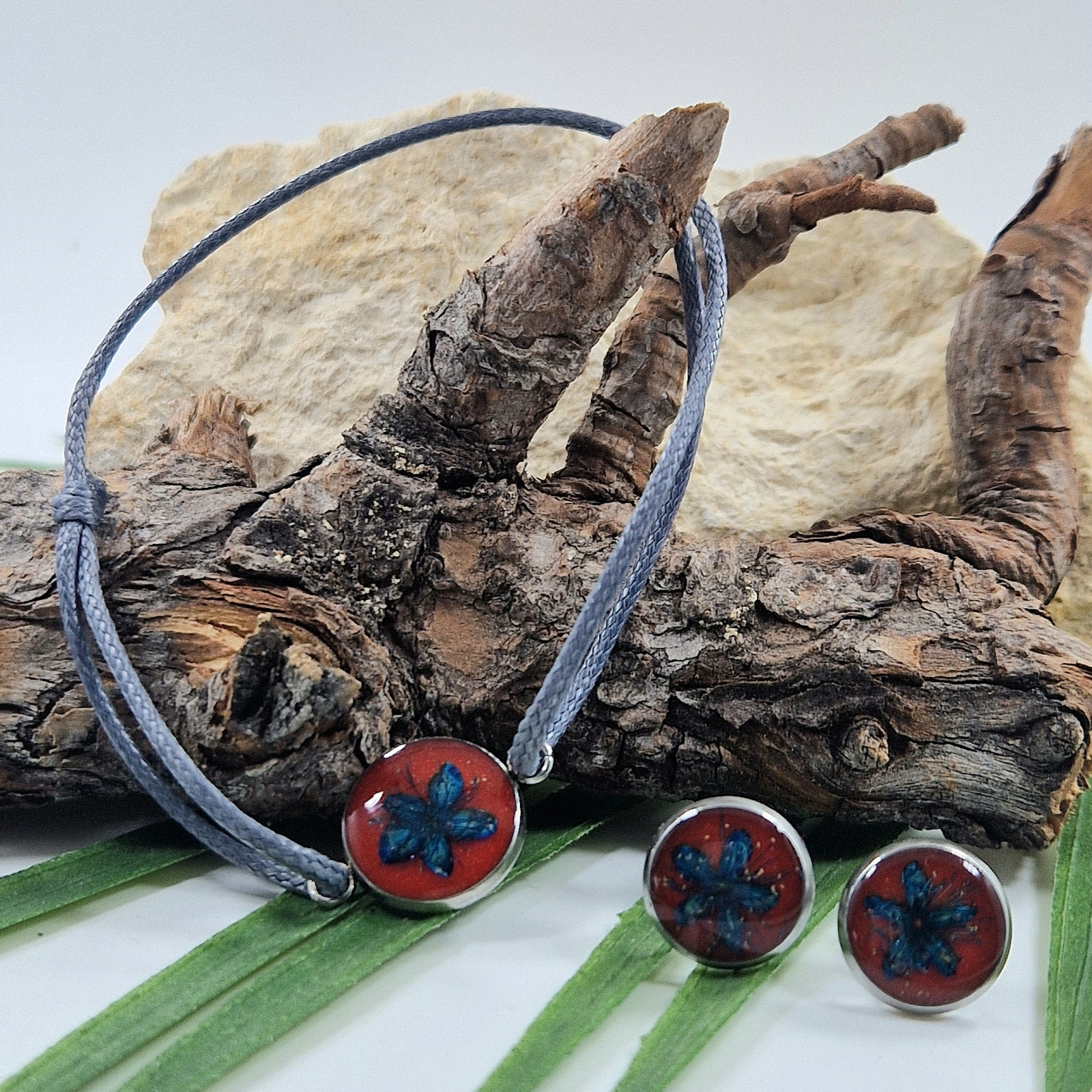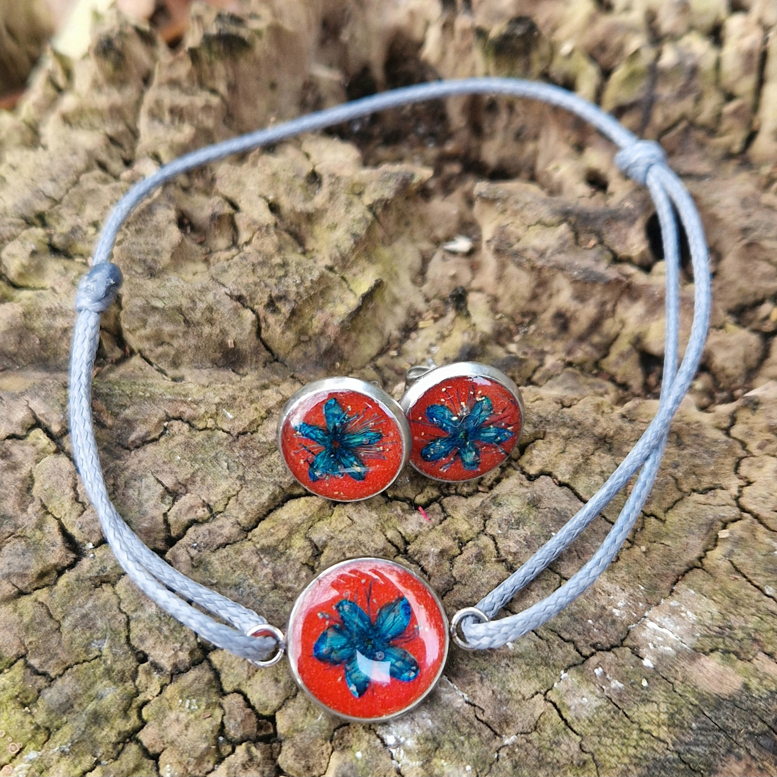 Ez az egyedi ékszer szett gyönyörűen ötvözi a természet csodáit és a modern dizájnt. A szett tartalmaz egy pár fülbevalót és karperecet, amelyek mezei virágokkal és kristálytiszta, UV-álló gyantával készültek.