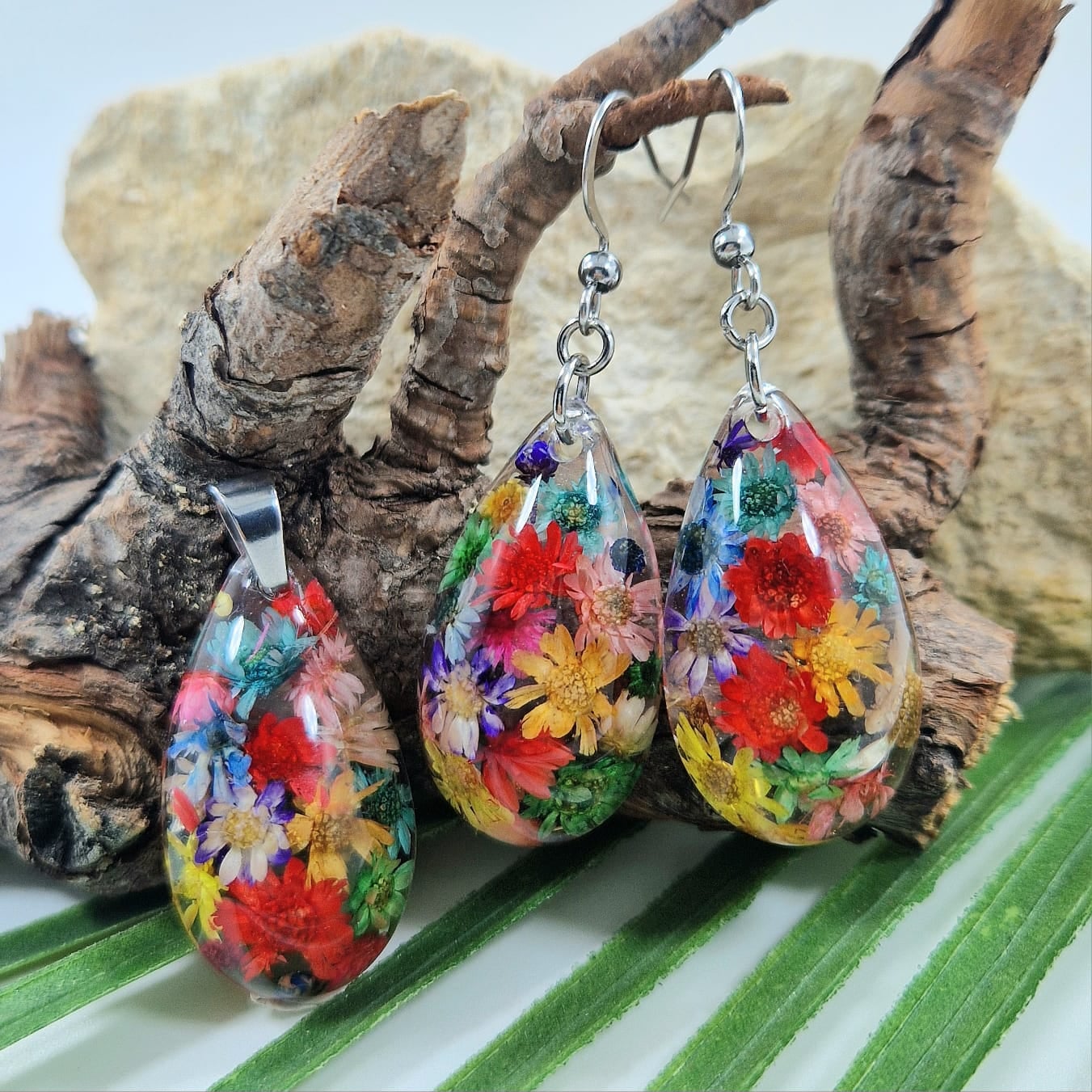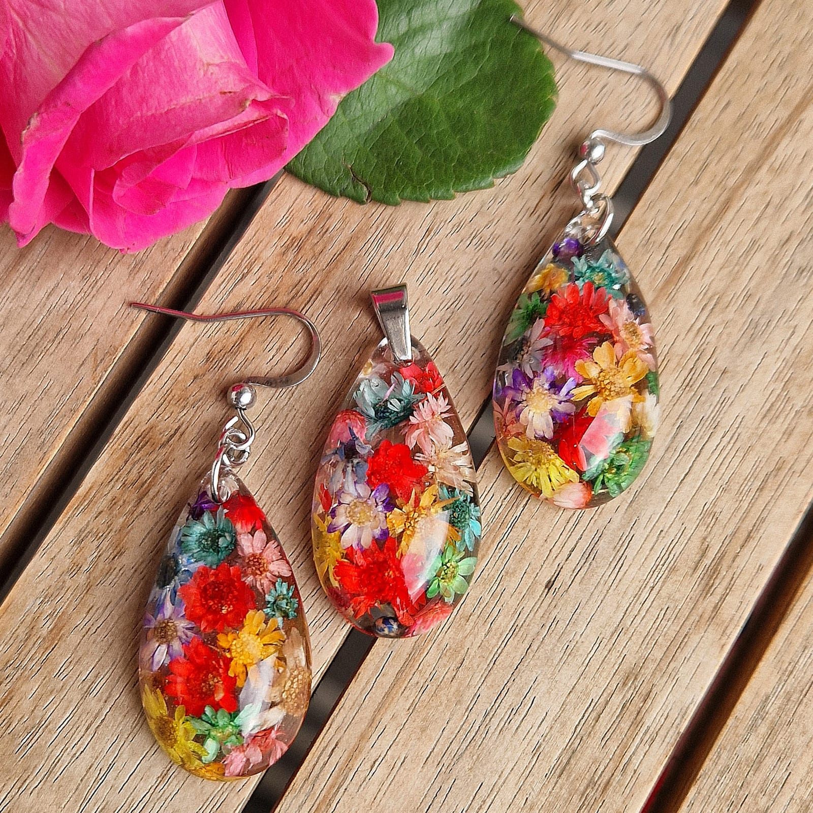 Ez az egyedi ékszer szett gyönyörűen ötvözi a természet csodáit és a modern dizájnt. A szett tartalmaz egy medált és fülbevalót, amelyek mezei virágokkal és kristálytiszta, UV-álló gyantával készültek.