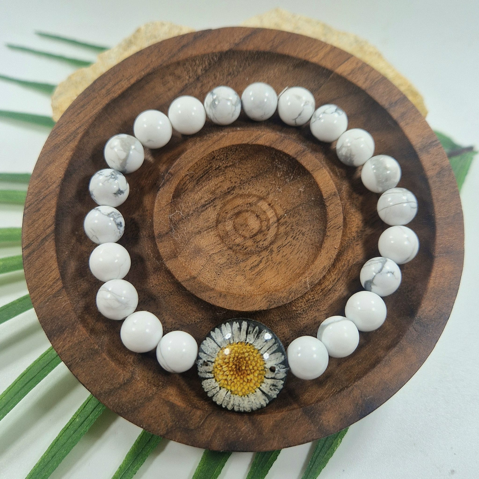A karkötő központi dísze egy kézzel készült medál igazi vadvirágokkal, amelyeket UV-álló gyantában konzerváltunk. A kristálytiszta gyanta hosszú időn át megőrzi a virágok finomságát és színeit, így minden darab teljesen egyedi és megismételhetetlen.