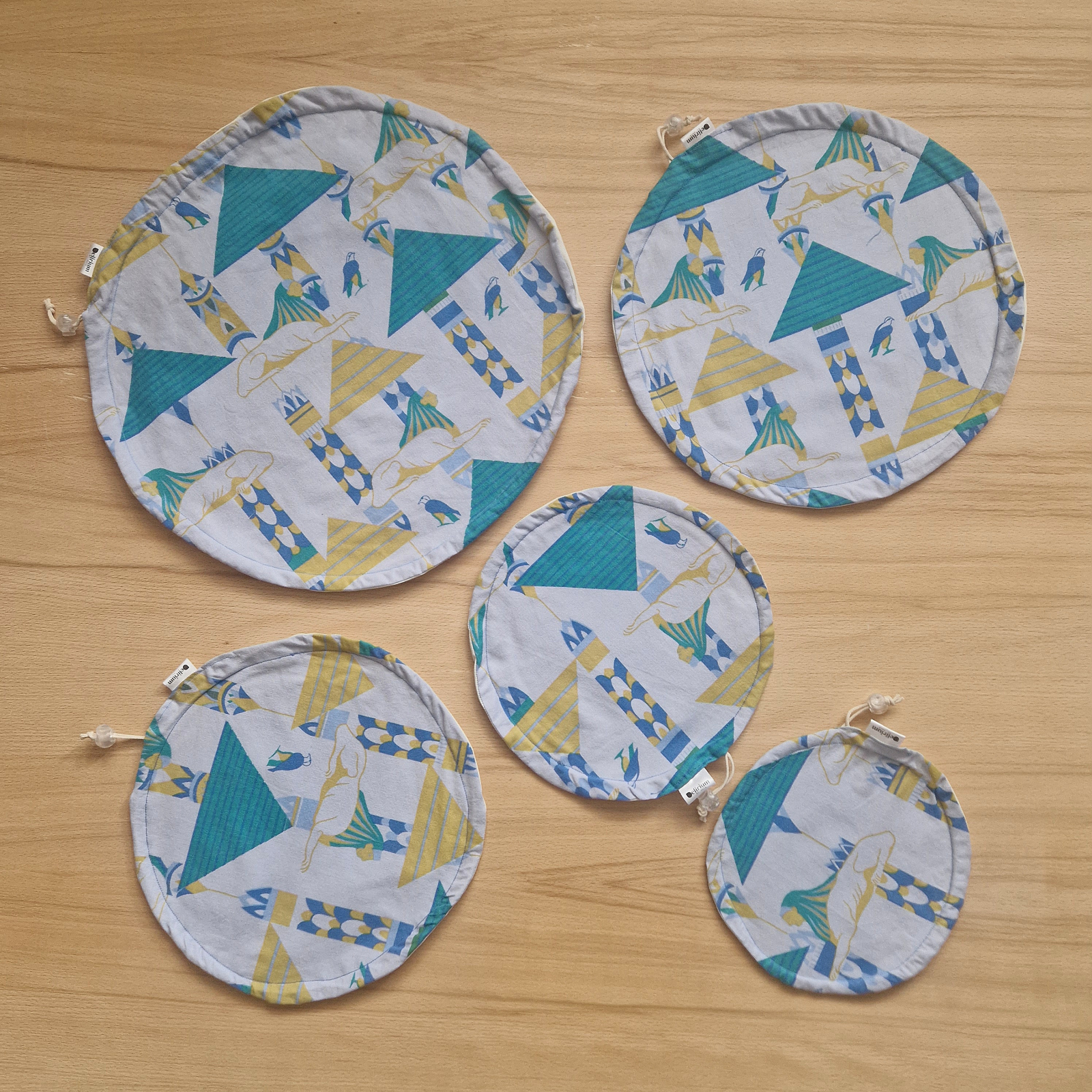Az edényhuzatok kerek alakúak, és könnyedén állíthatók a pamut zsineg és rugós zsinór vég segítségével. Méretük rugalmasan igazítható a letakarni kívánt tányérokhoz vagy edényekhez, így mindig tökéletesen illeszkednek.