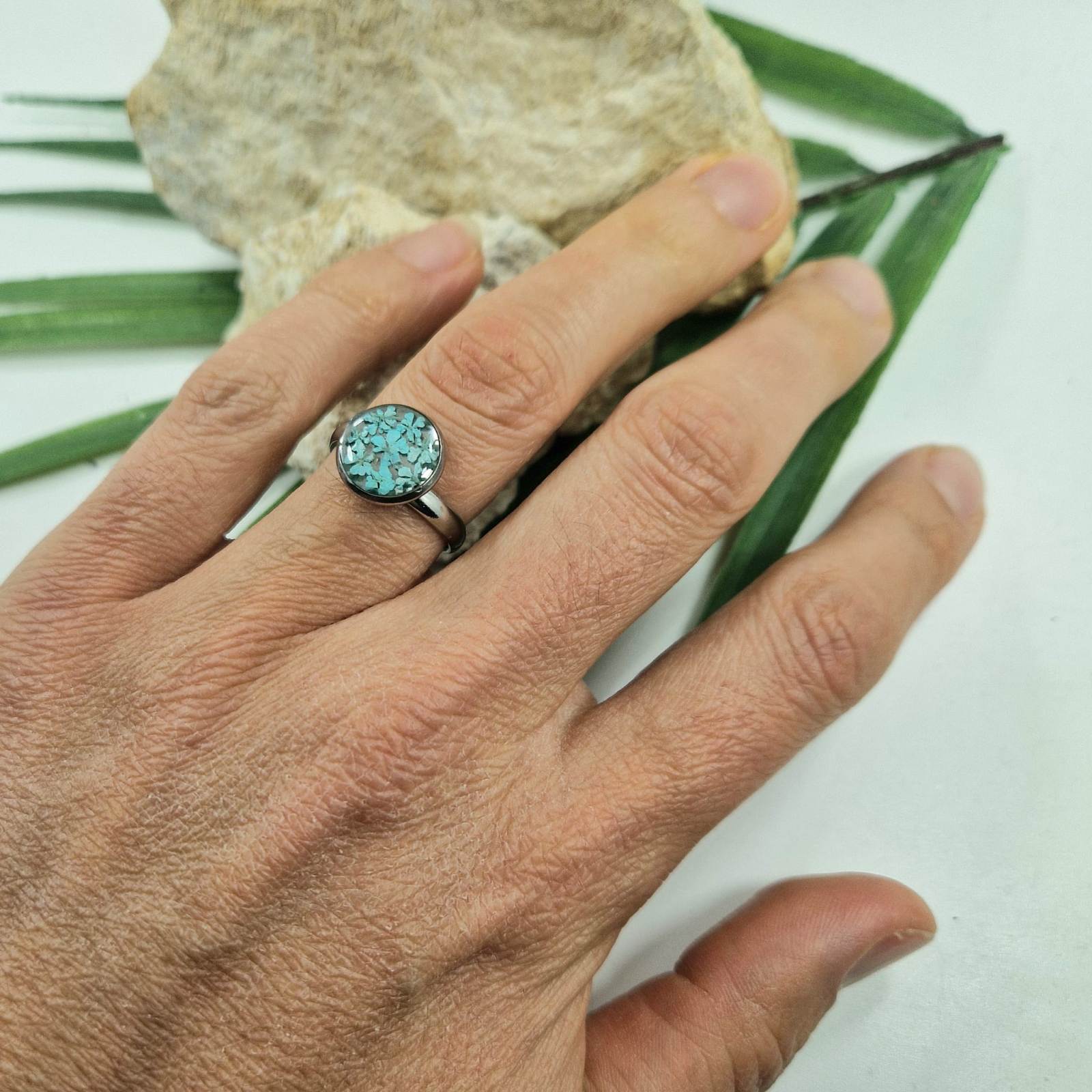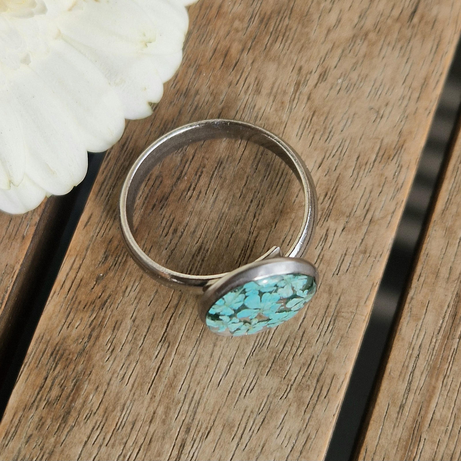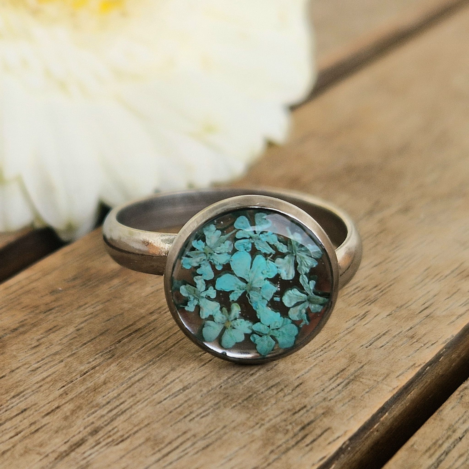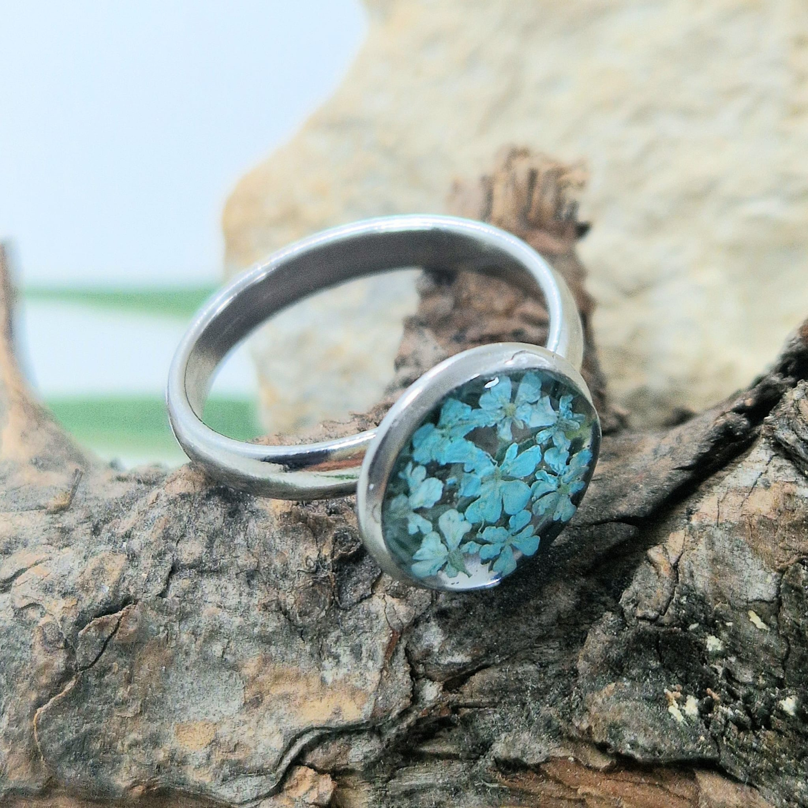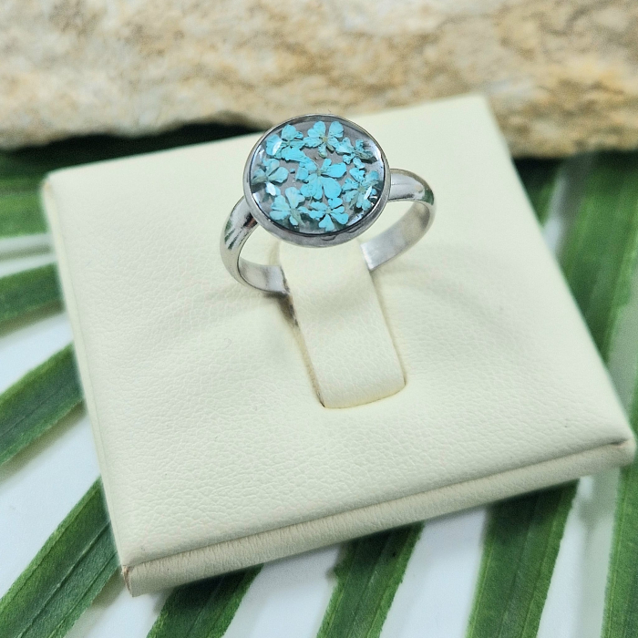 Aceast inel realizat manual îmbină farmecul naturii cu tehnologia modernă a rășinii, creând o bijuterie unică și fascinantă. Detaliile delicate ale floriilor  sunt protejate de rășina UV, care garantează că culorile vibrante și frumusețea naturală a florilor vor rămâne intacte. Oțelul inoxidabil asigură o purtare sigură și o durabilitate îndelungată.